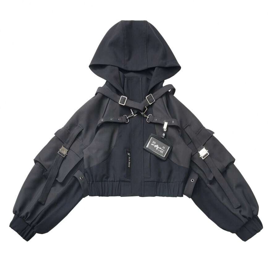 サイバーパンクな世界観を凝縮したショート丈ジャケットです。 胸元で交差する複雑なハーネスベルトとIDパスケースが、近未来的