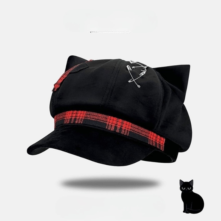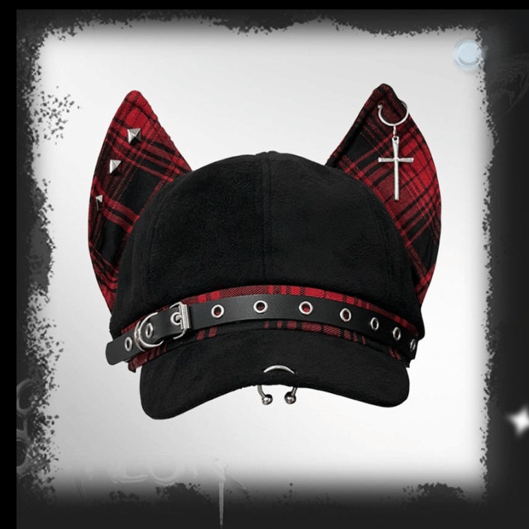 黒ベースに赤チェック帯と金具装飾が入った猫耳キャスケットの例