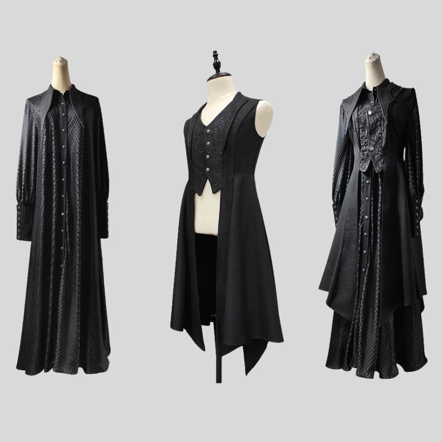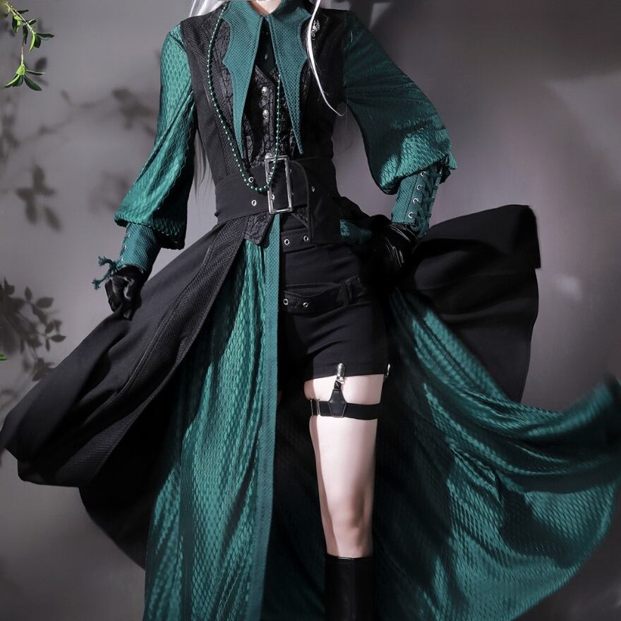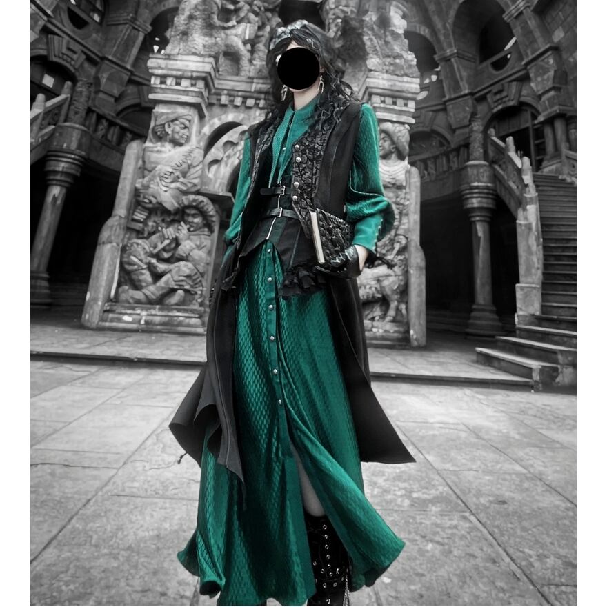 病み可愛いダークゴシックなロングシャツワンピとロングベストのセットアップです。