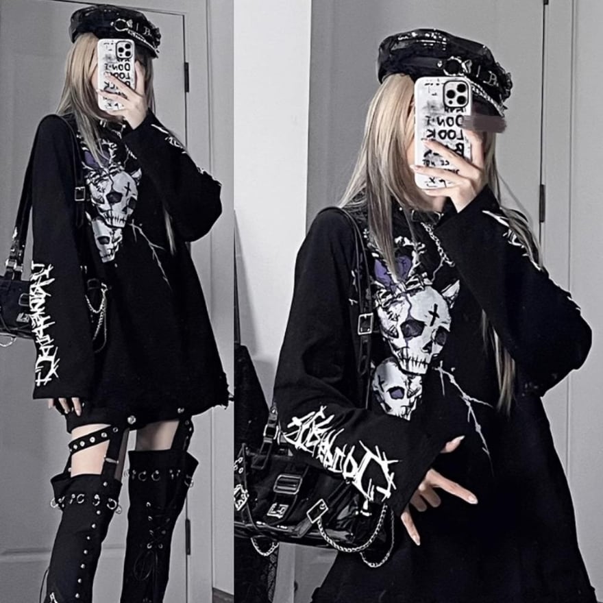 サブカル 服 地雷系 通販 服 パンクファッション Dead Body フード付き 長袖シャツ スカル柄 ダークゴシック 闇かわいい