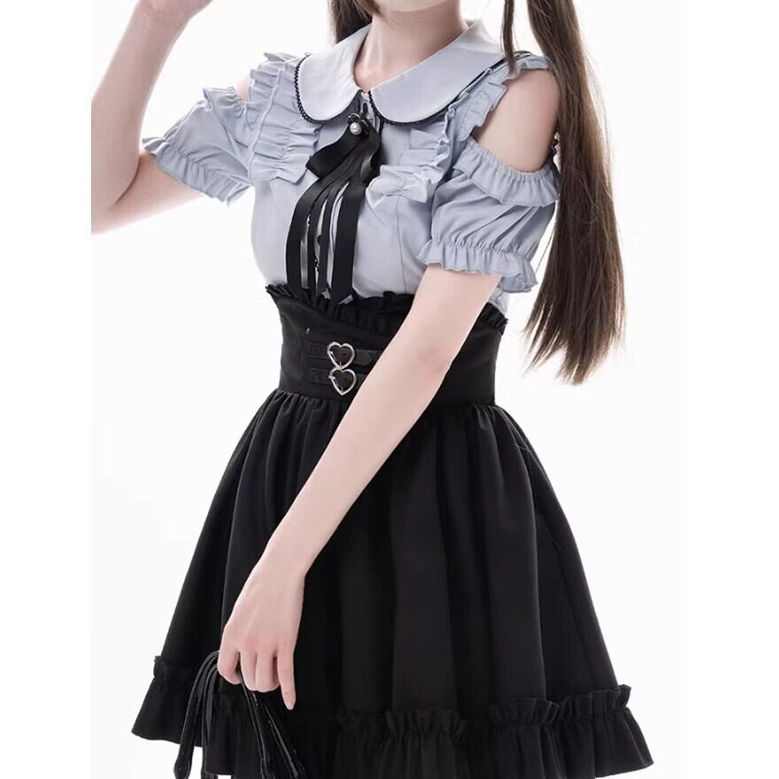 サブカル 服 地雷系 通販 系 コーデ セットアップ 半袖 サスペンダー スカート ネックリボン フリル 可愛い レトロ 系ファッション 量産型