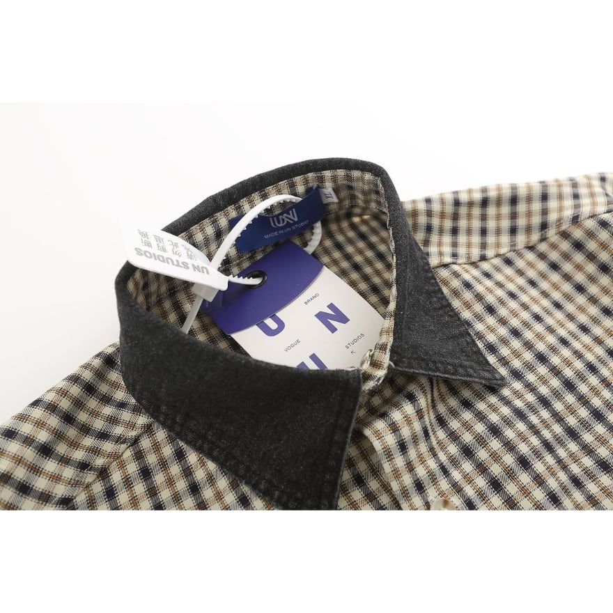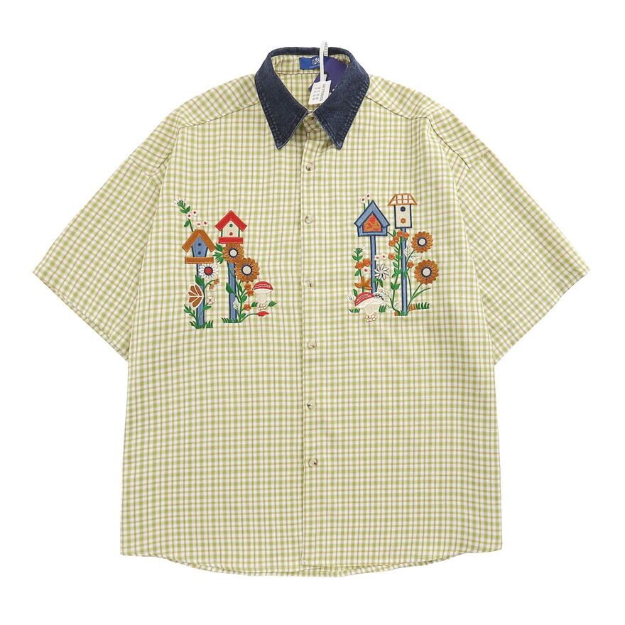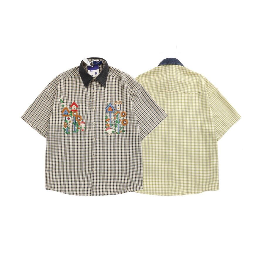 サブカル 服 地雷系 通販 アメカジ 半袖シャツ チェック柄 刺繍 レトロ カレッジスタイル カップルコーデ 春夏服