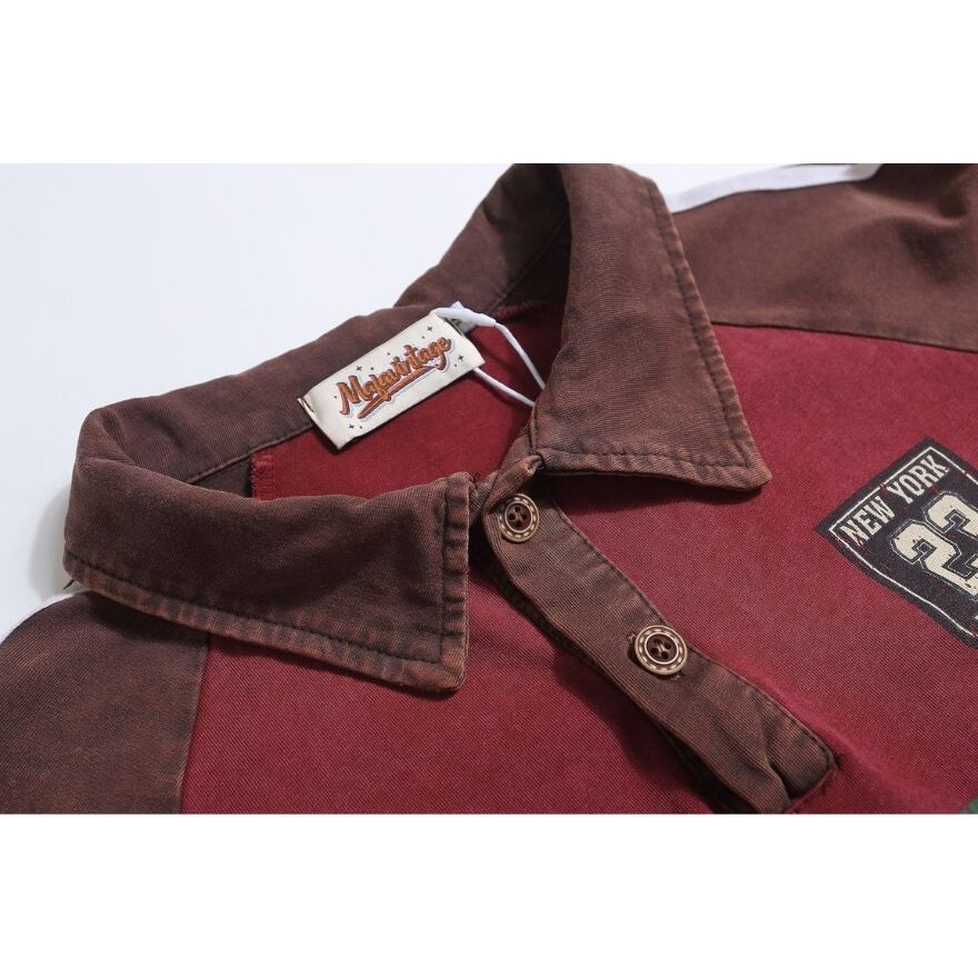 "カレッジ風のロゴと、配色デザインが目を引く、アメカジ風半袖ポロシャツです。
