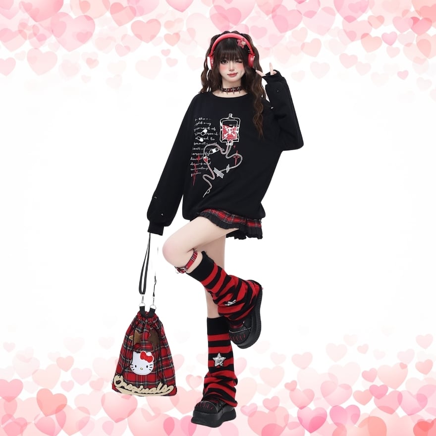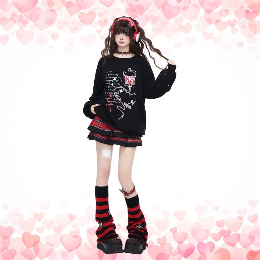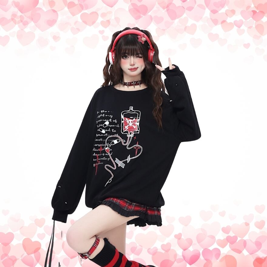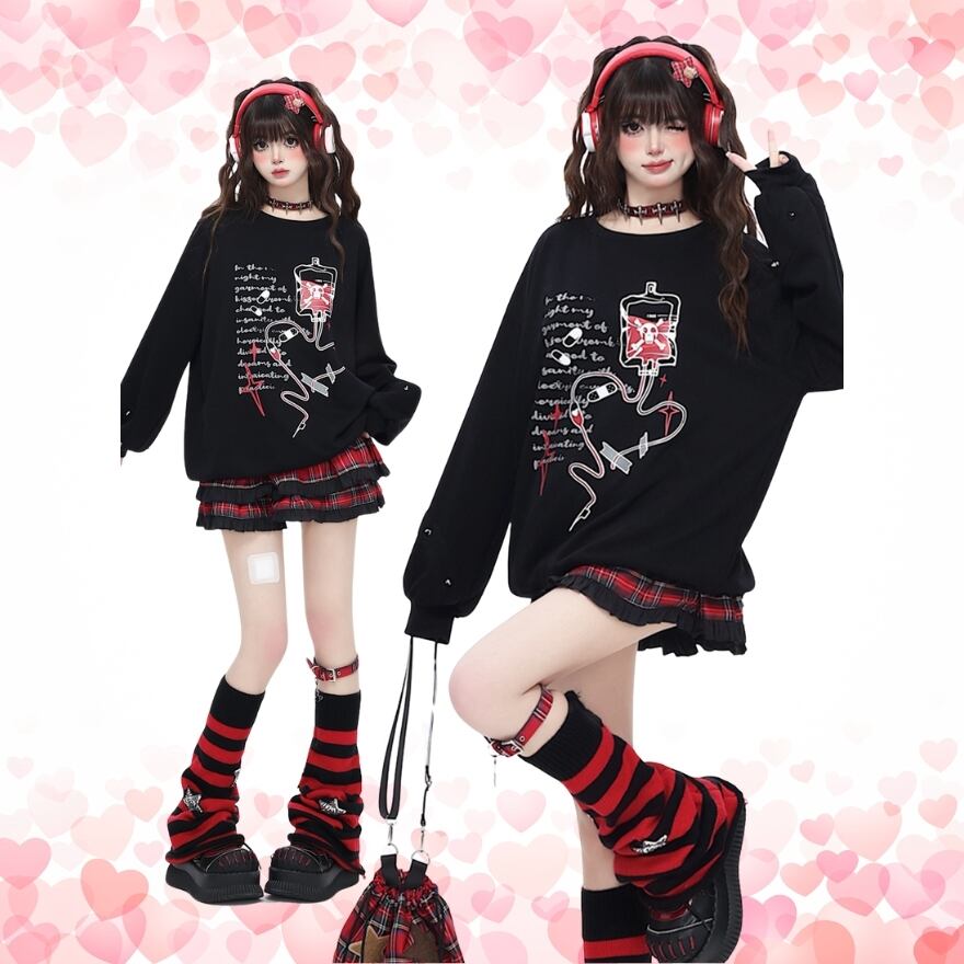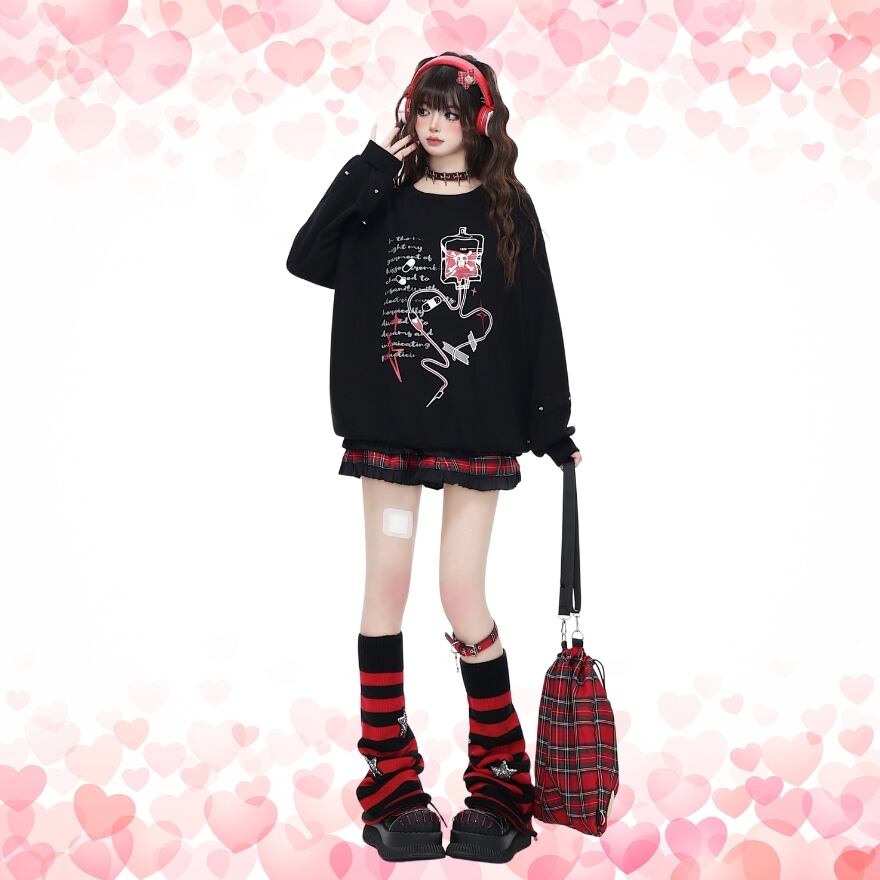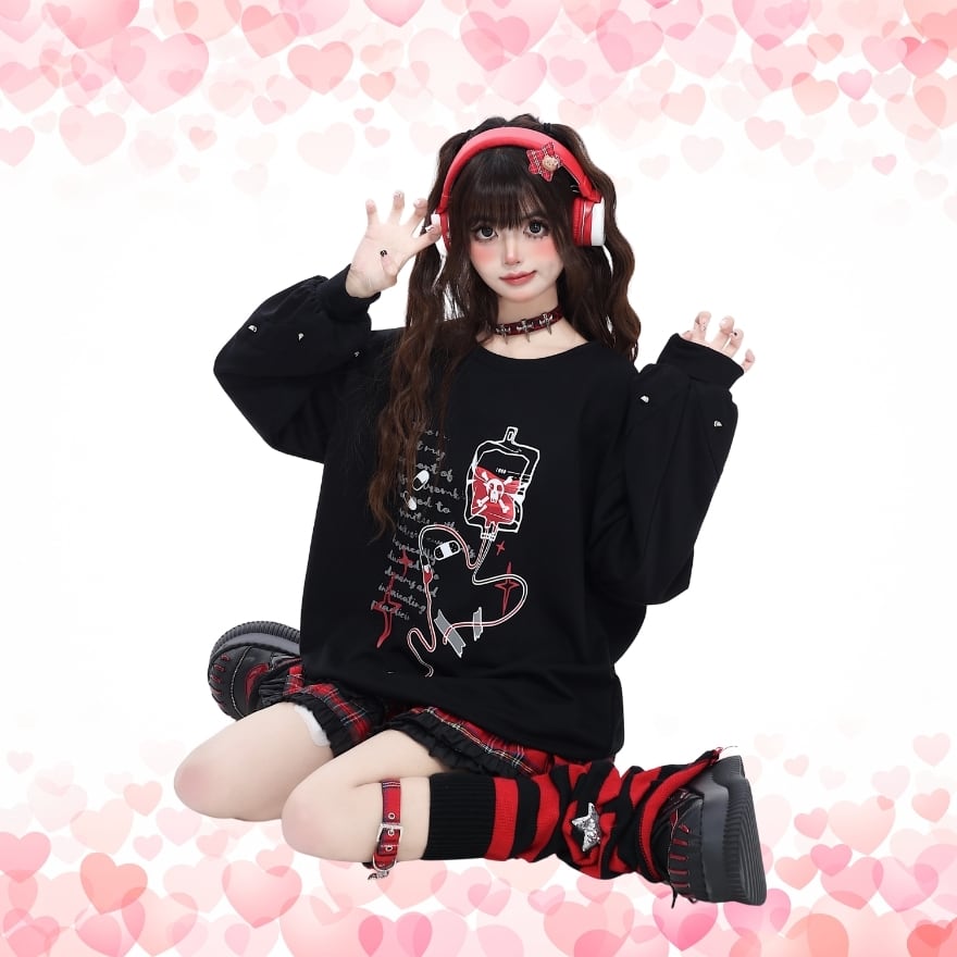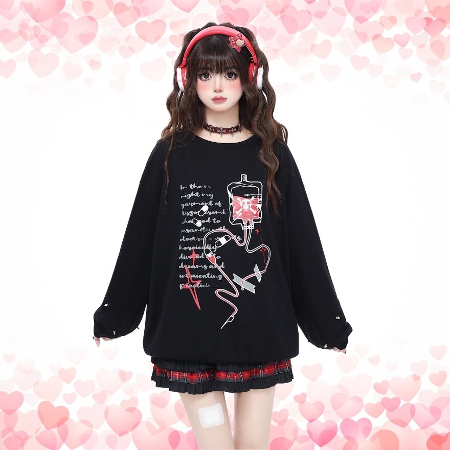 禁断の輸液プリント: 輸液と退廃的な英文がプリントされたトップスは、ミステリアスで退廃的な雰囲気を演出します。