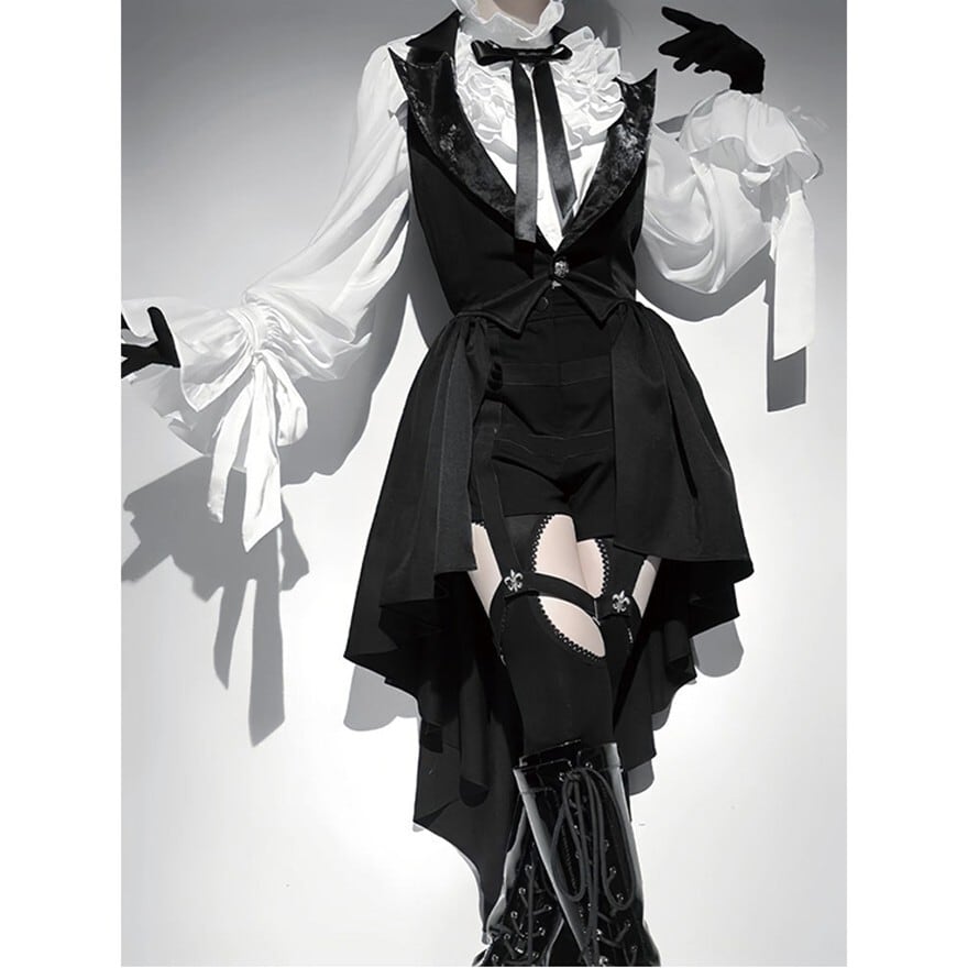 アシンメトリーな裾、コルセット風デザイン、そして燕尾服のようなシルエットが、ロイヤルでダークゴシックな雰囲気を演出します。