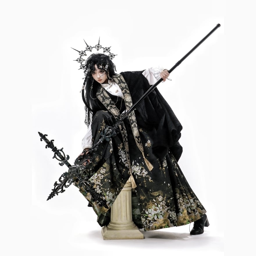 チャイナドレスの要素を取り入れた、上品でミステリアスな雰囲気のケープです。繊細なレースや刺繍、タッセルなどの装飾が、オリエンタルな魅力を引き立てくれます。