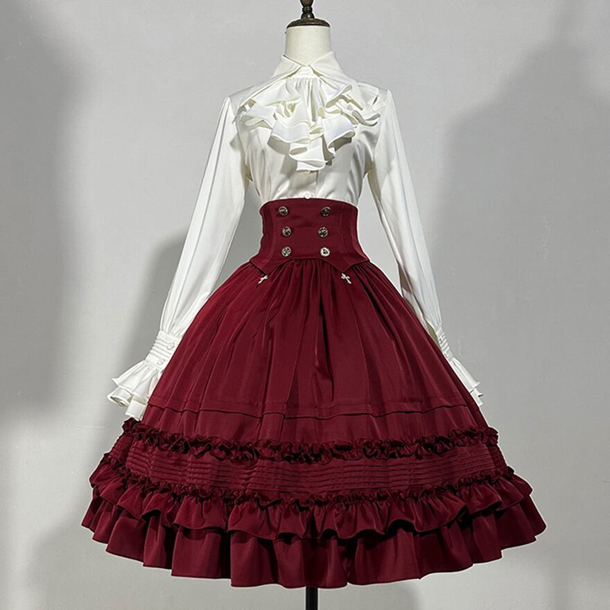 オフホワイトの滑らかな生地に、胸元から襟にかけて幾重にも重なる繊細なフリルが印象的な、クラシカル ロリータ ブラウス。