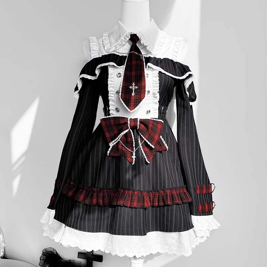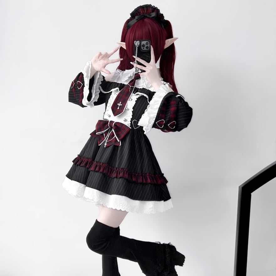・赤色のチェック柄やリボンが、パンクテイストのアクセントに