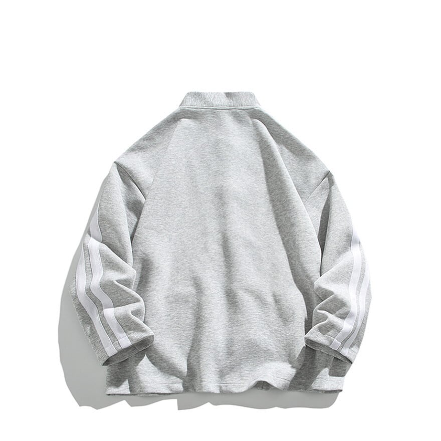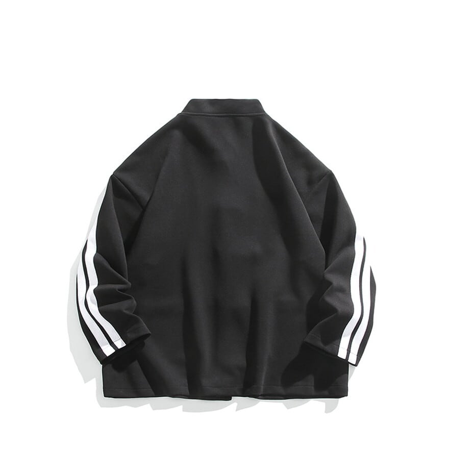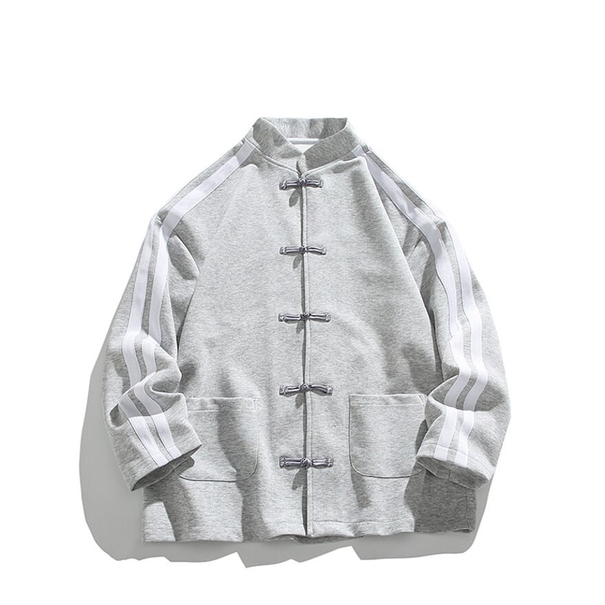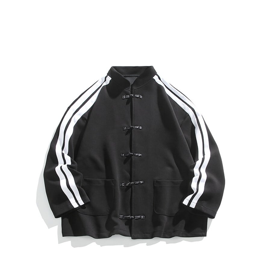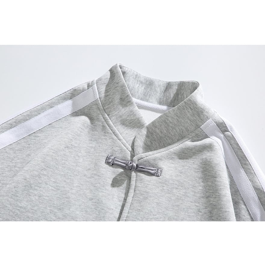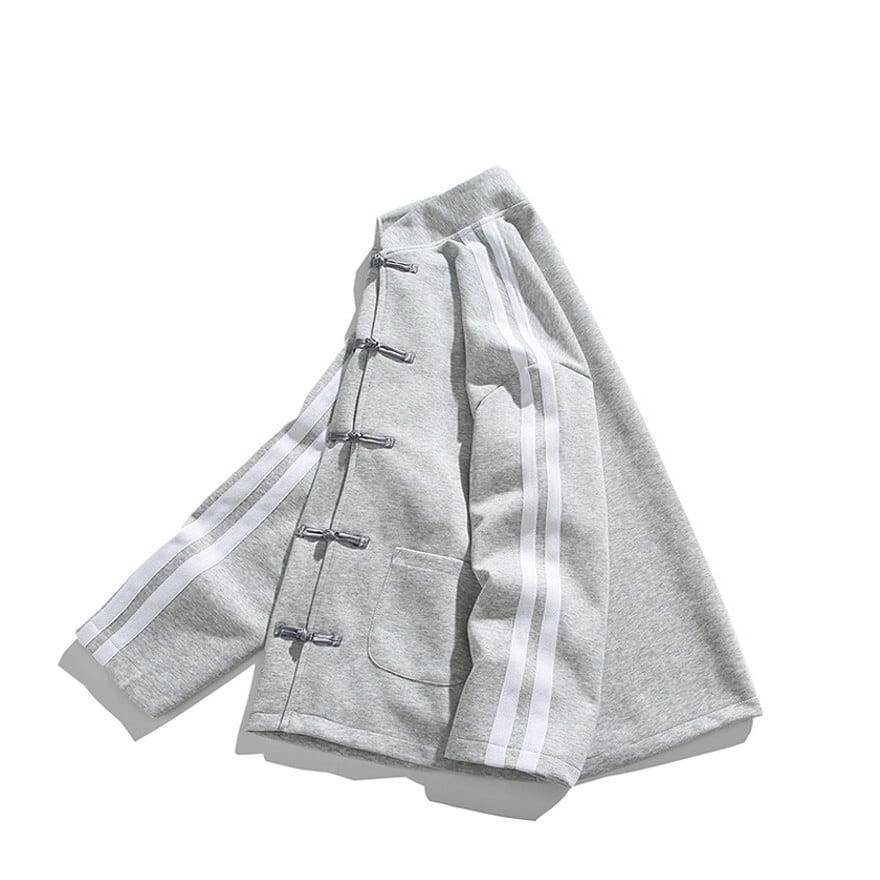 スタイリッシュなスタンドカラーと、目を引くチャイナボタンが特徴のジャケットは、袖に配されたサイドラインがスポーティーなアクセント。