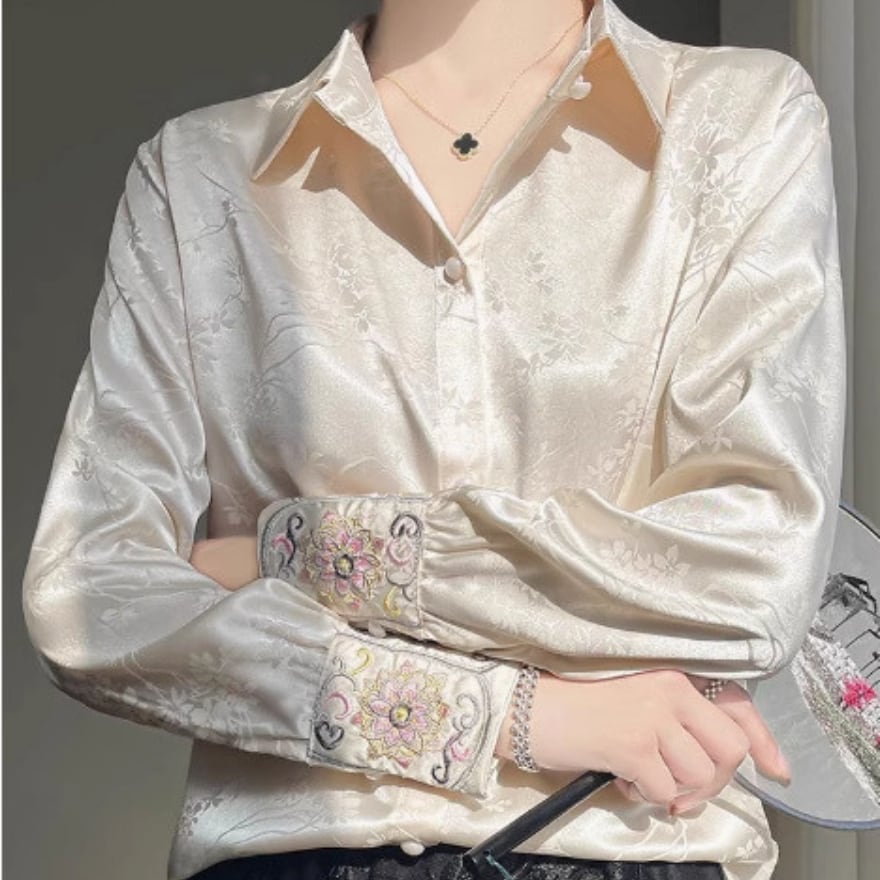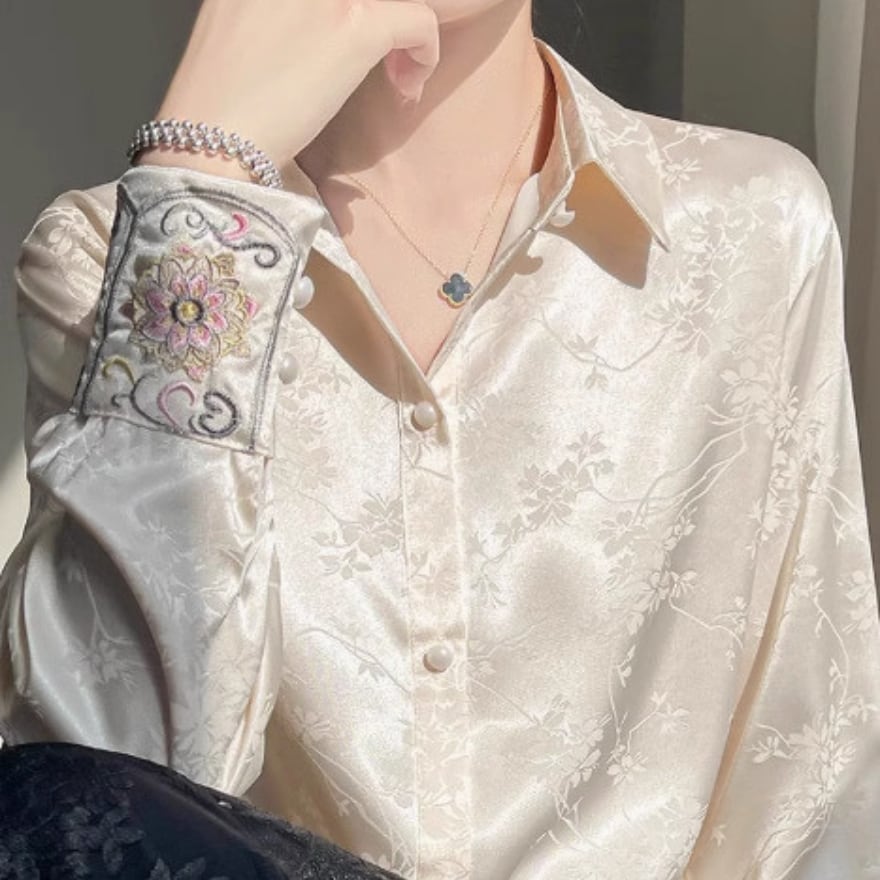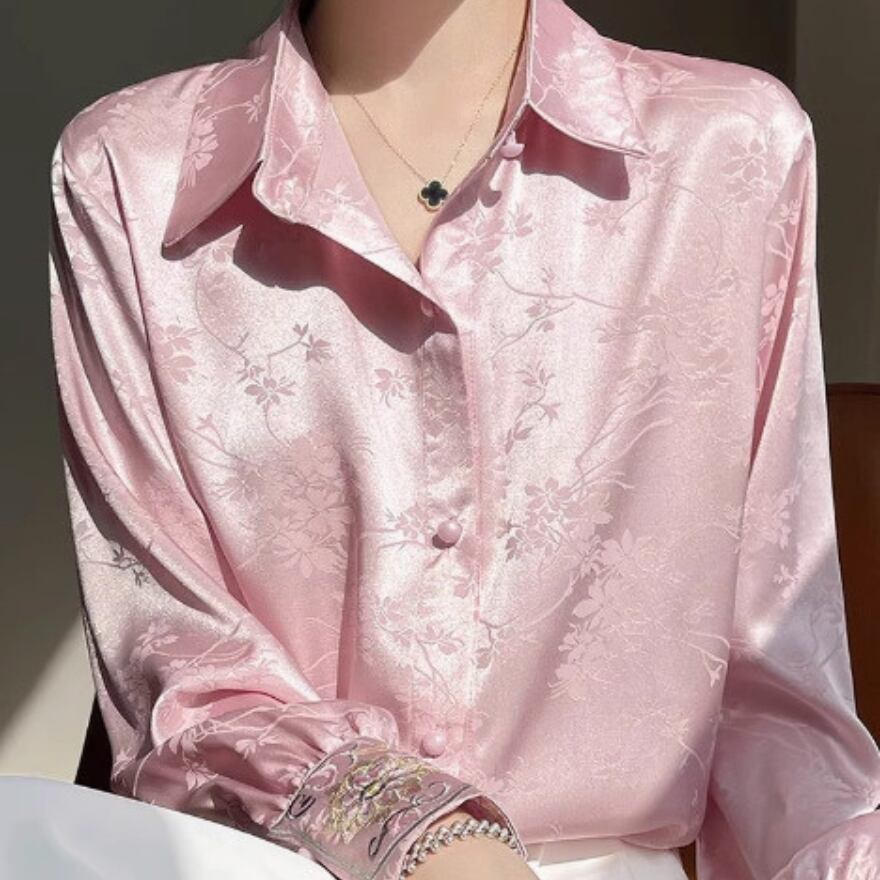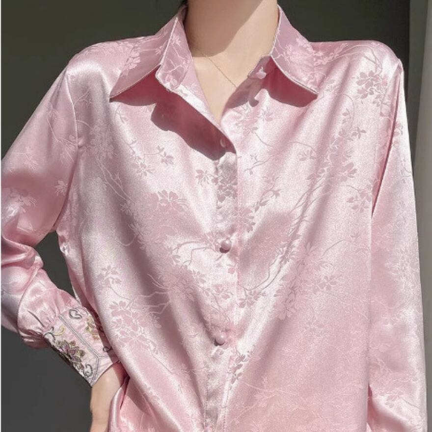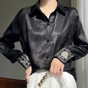 艶やかな生地とチャイナボタンが、オリエンタルなムードを漂わせる長袖シャツです。