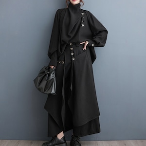 アシンメトリーなデザインが特徴的な、モード系デザインシャツとワイドパンツ