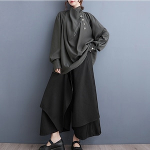 可愛さキープで大人増しなストリートファッションを纏う、とろみ感のある長袖とアシンメトリーなワイドパンツの上下セット割りです