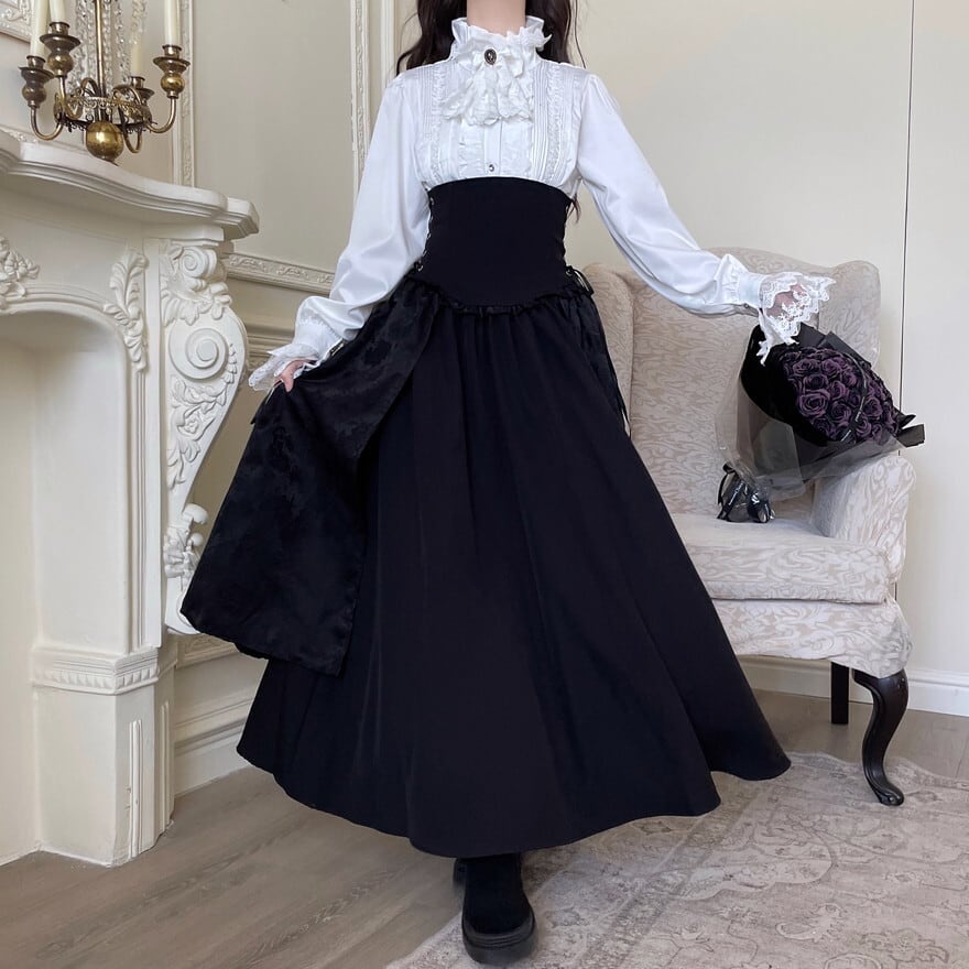 深みのある黒色のスカートとケープに、繊細なフリルとレースが美しいブラウスを合わせることで、統一感がありながらもそれぞれのアイテムの魅力が際立つコーディネートです。