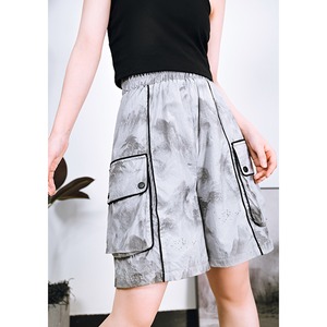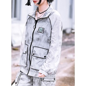 グレーとホワイトの濃淡で山水画が描かれた生地を使用。スタンドカラーにジッパー、フロントのフラップポケット、そして袖口と裾はゴム仕様になっています。