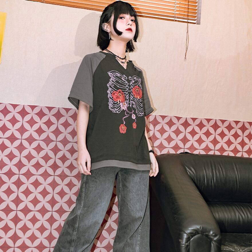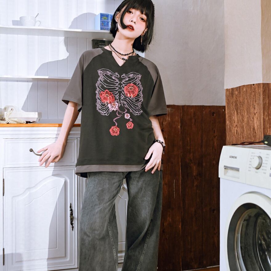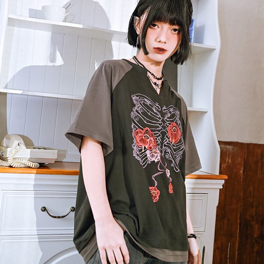 ブラックのボディとグレーのラグラン袖のバイカラーデザイン。胸元にはスケルトンの肋骨とバラのモチーフが描かれています。Vネックですっきりとした印象です。