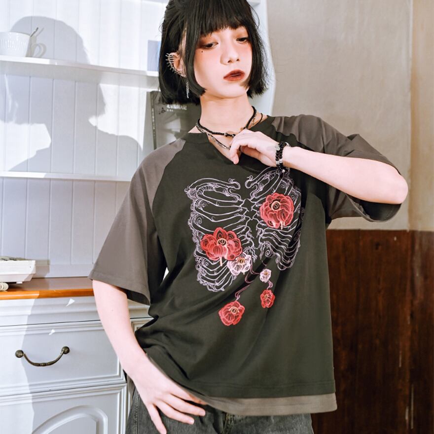 このTシャツの魅力は、そのアイコニックなプリントデザインです。肋骨に咲くバラという、ダークながらもロマンティックなモチーフが、個性的な「闇かわいい」スタイルを演出
