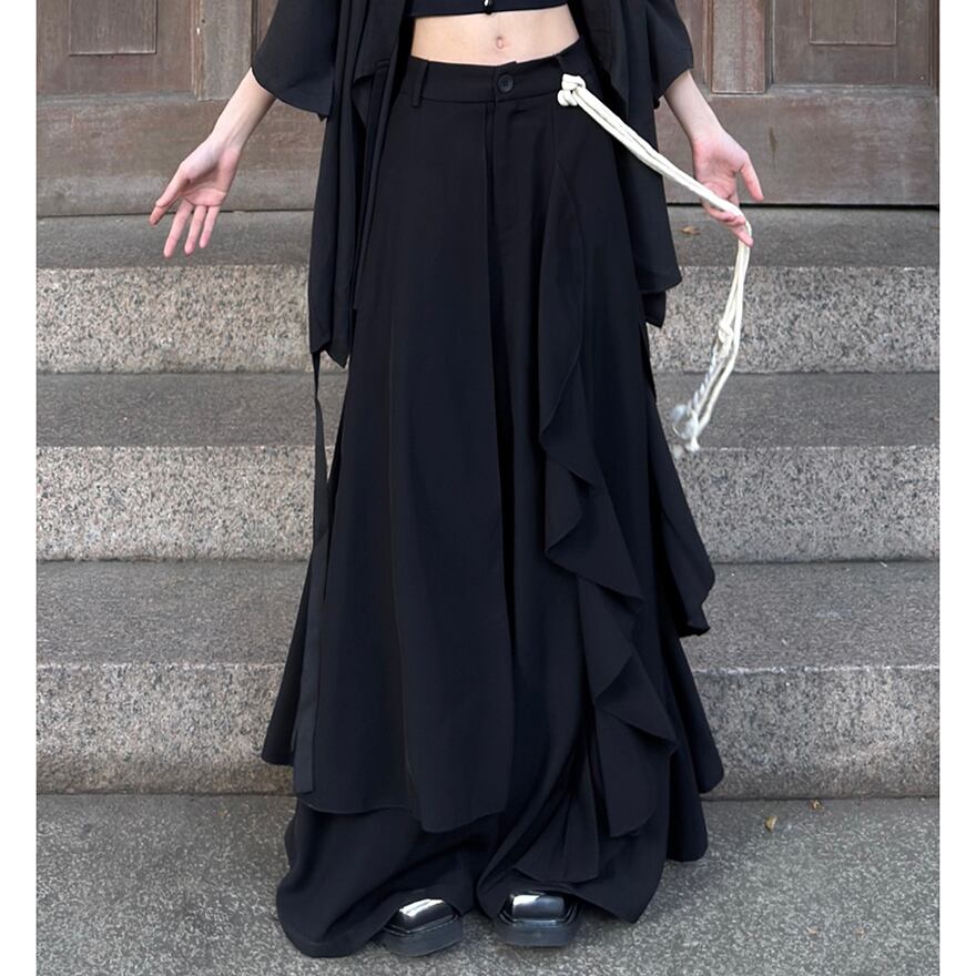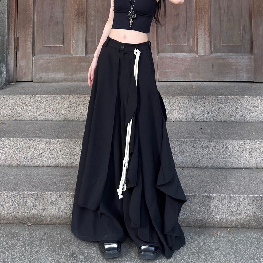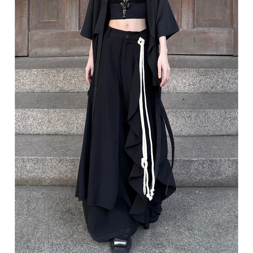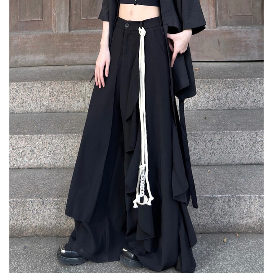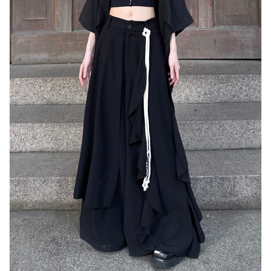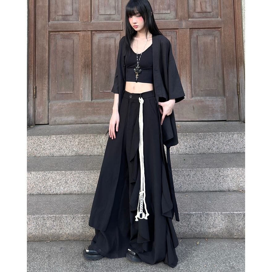 このチャイナ風ワイドパンツは、サブカル系ファッションに新たな風を吹き込むアイテム。ブラックカラーがシックでありつつ、独自のデザインが個性的な魅力を引き立てます。軽やかな素材感とゆったりとしたシルエットが、快適さとスタイルを両立させています。