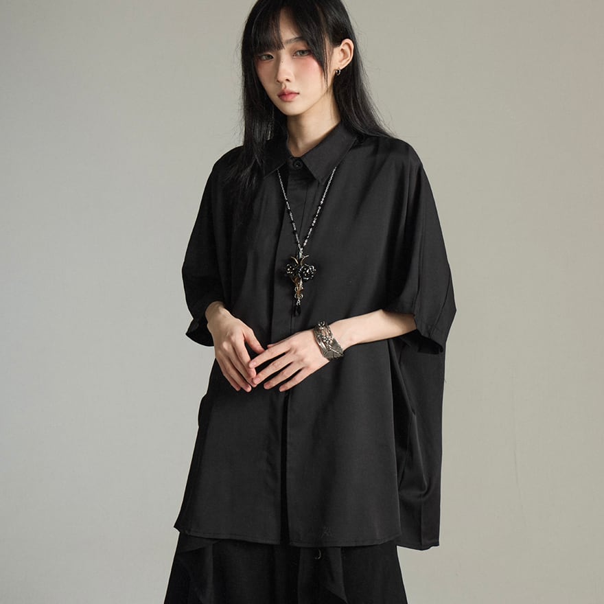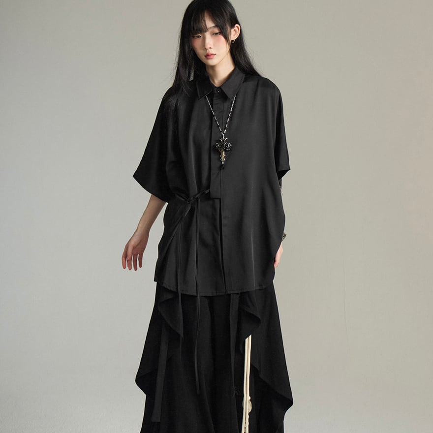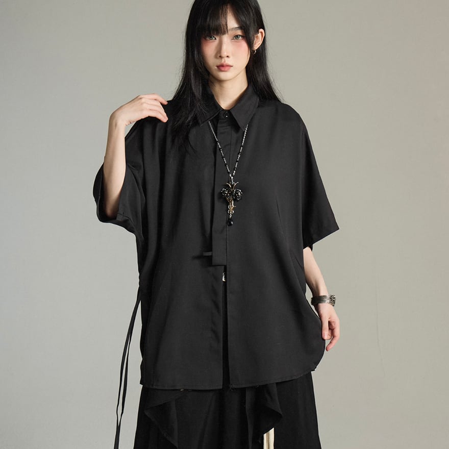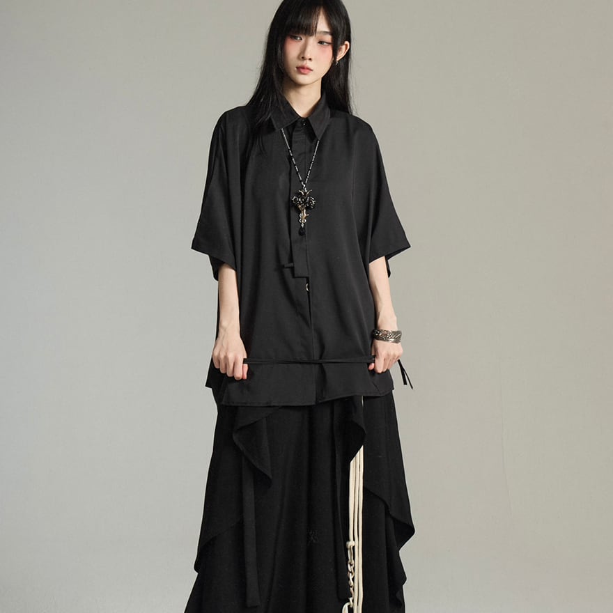 この漆黒のチャイナ風半袖シャツは、サブカル系ファッションを愛する方々に最適なアイテムです。ブラックを基調とした重厚感のあるデザインが特徴で、様々なコーディネートに取り入れやすい。シャツ部分のゆとりあるシルエットに、ネックレスなどのアクセサリーがアクセントを加え、全体としてダークで神秘的な印象を醸し出しています。