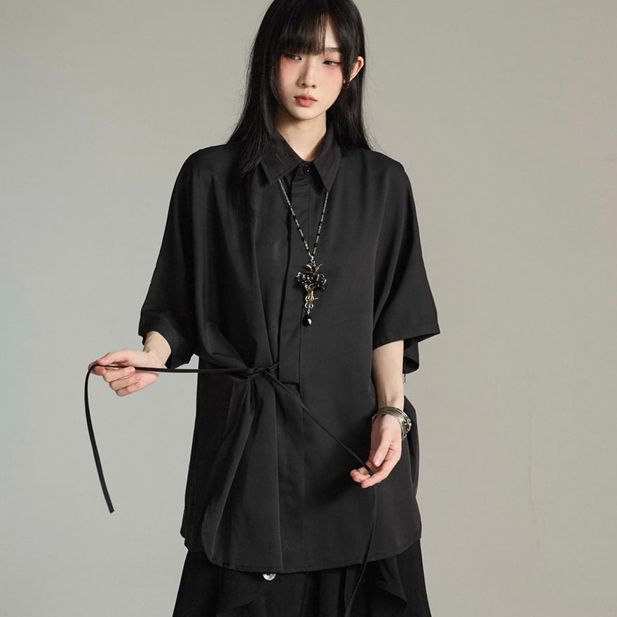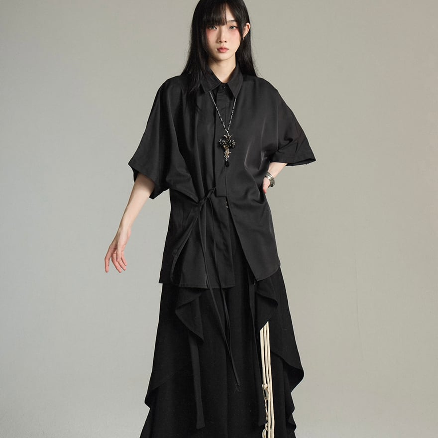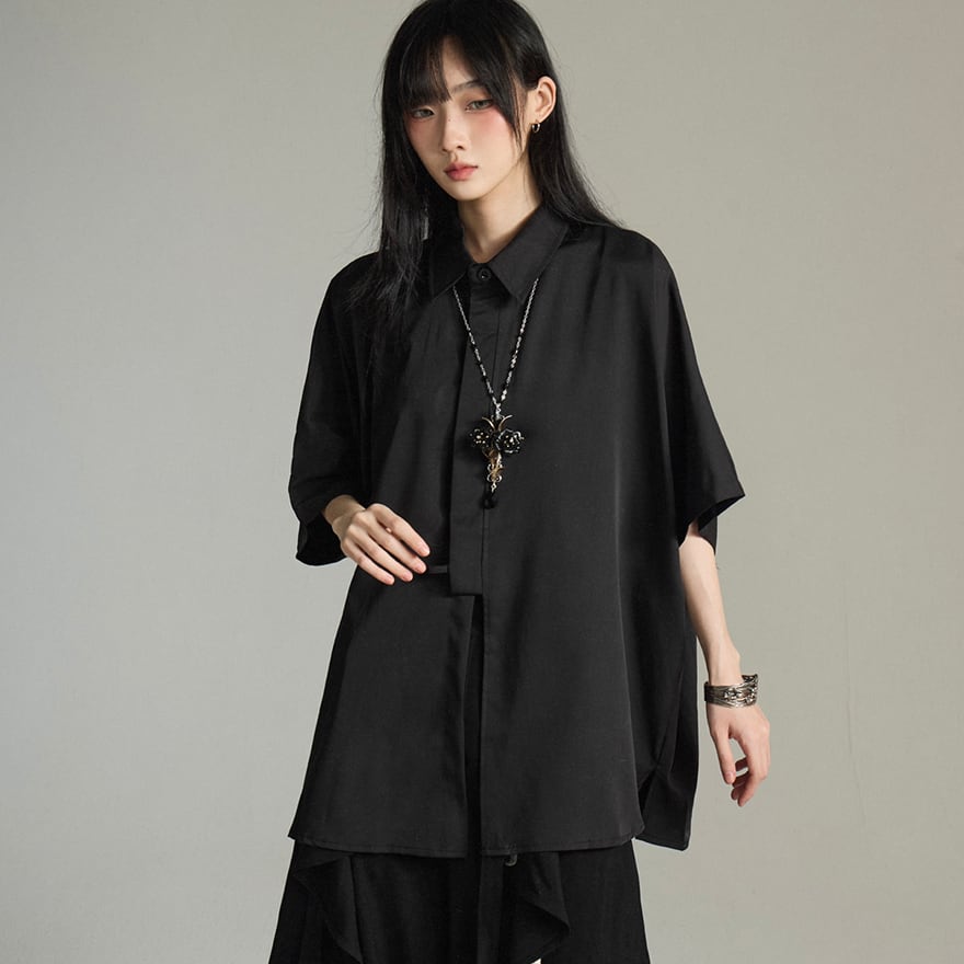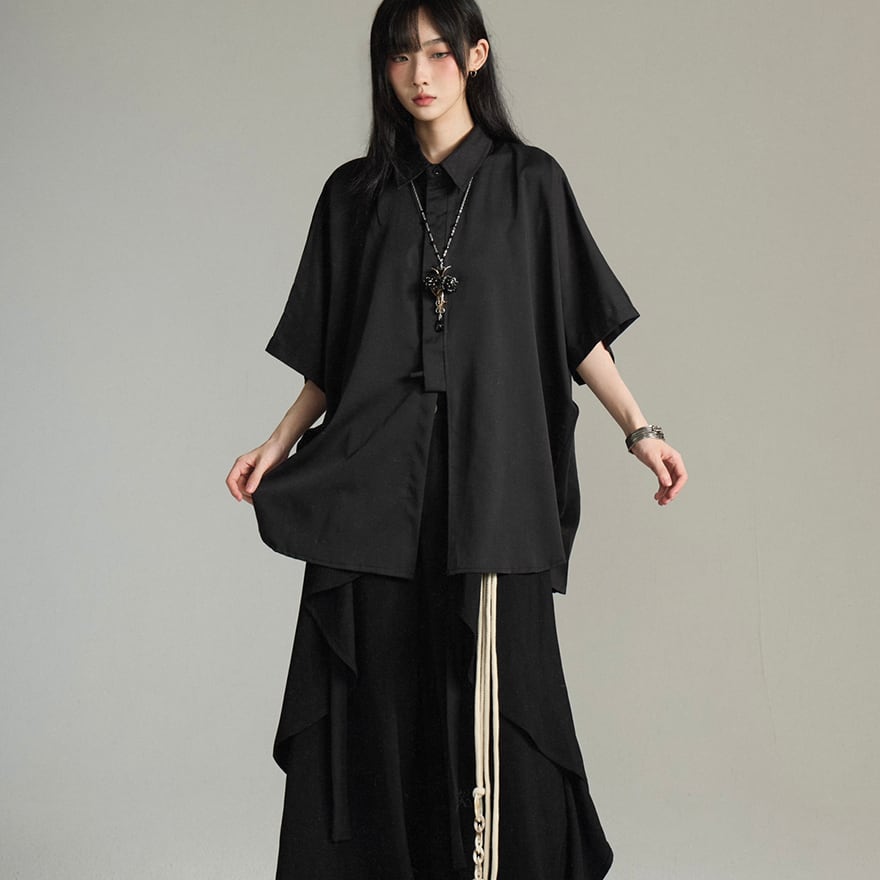 この漆黒のチャイナ風半袖シャツは、サブカル系ファッションを愛する方々に最適なアイテムです。ブラックを基調とした重厚感のあるデザインが特徴で、様々なコーディネートに取り入れやすい。シャツ部分のゆとりあるシルエットに、ネックレスなどのアクセサリーがアクセントを加え、全体としてダークで神秘的な印象を醸し出しています。