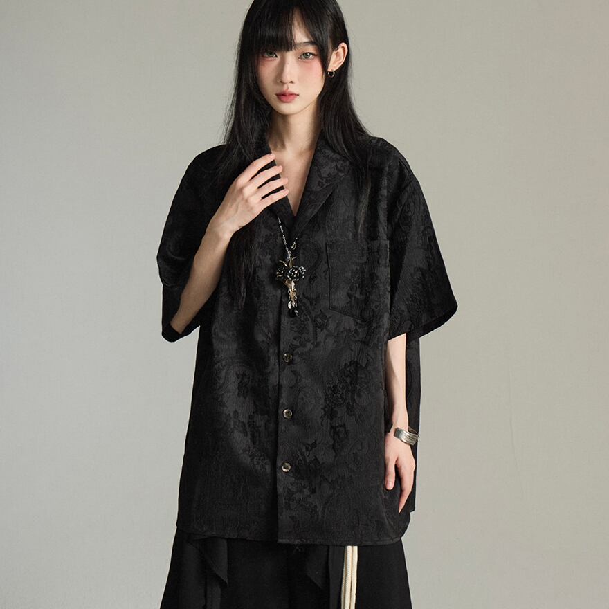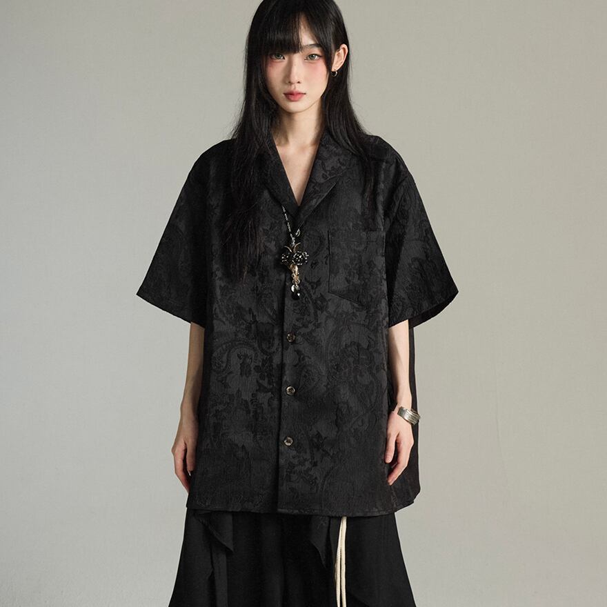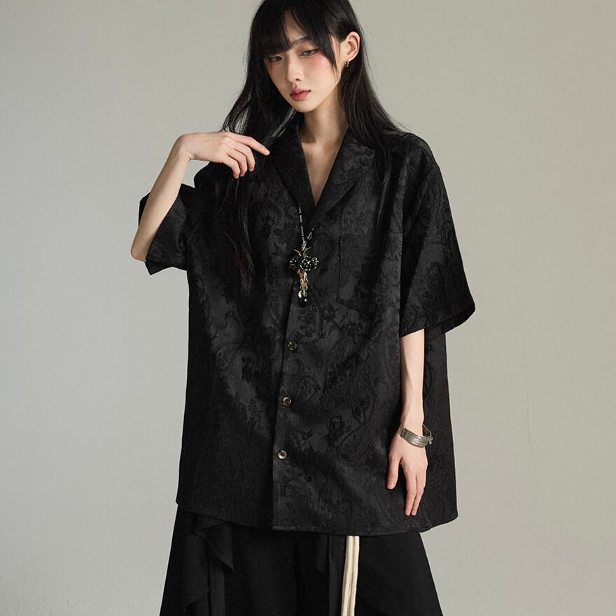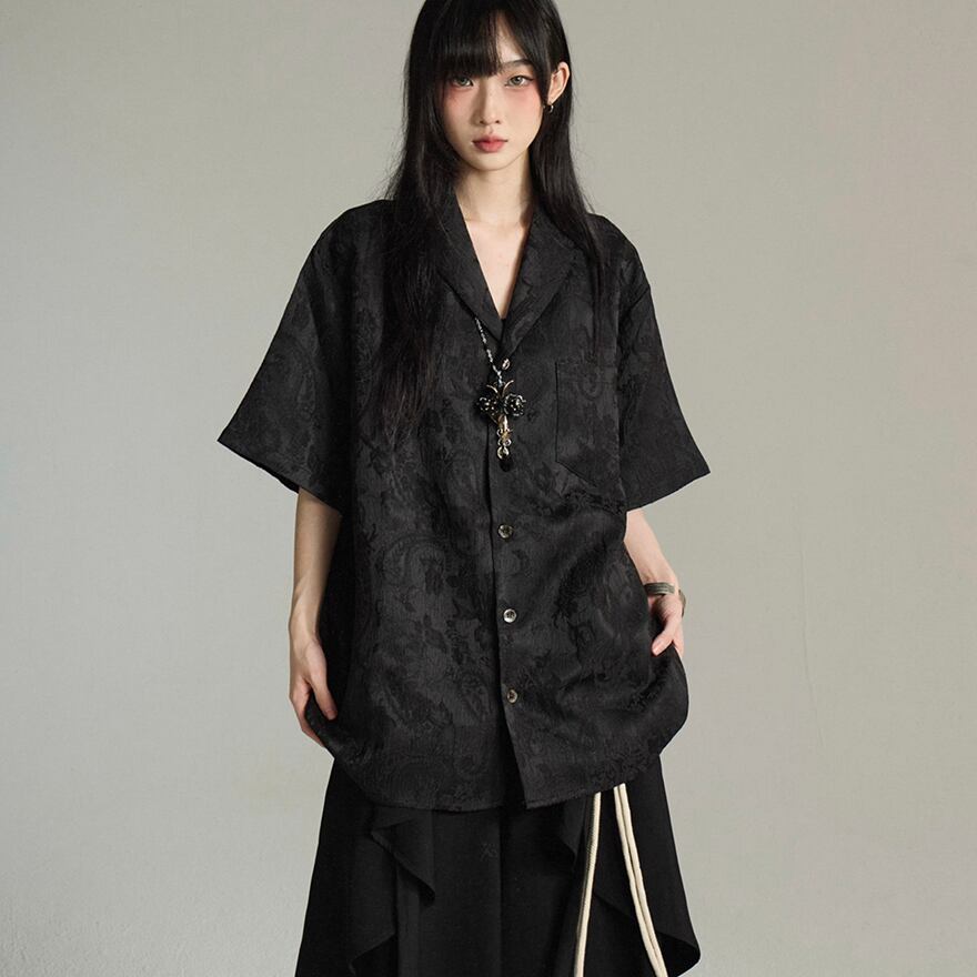 この繊細で個性的な半袖シャツは、サブカル系ファッションを愛する方々に最適なアイテムです。柔らかな色合いと繊細な刺繍が特徴で、様々なコーディネートに取り入れやすい。シャツ部分のゆとりあるシルエットに、大胆なサークル型のアクセサリーがアクセントを加え、全体としてエッジの効いた印象を醸し出しています。