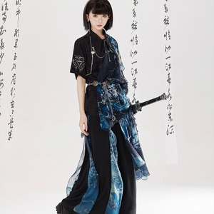 この個性的なチャイナ風セットアップは、ブラックの地に鮮やかな青と白の花柄が施されたユニークなデザインです。ゆったりとしたシルエットと長めの丈が、ロマンチックな雰囲気を醸し出しています。ベルト付きで、シルエットのアクセントにもなっています。