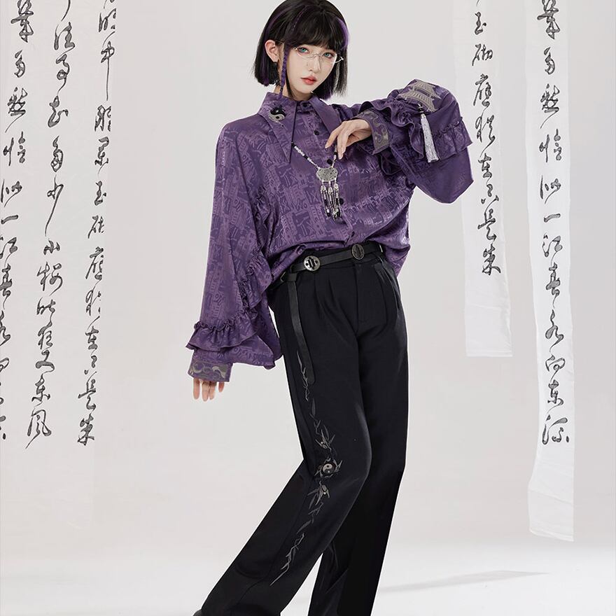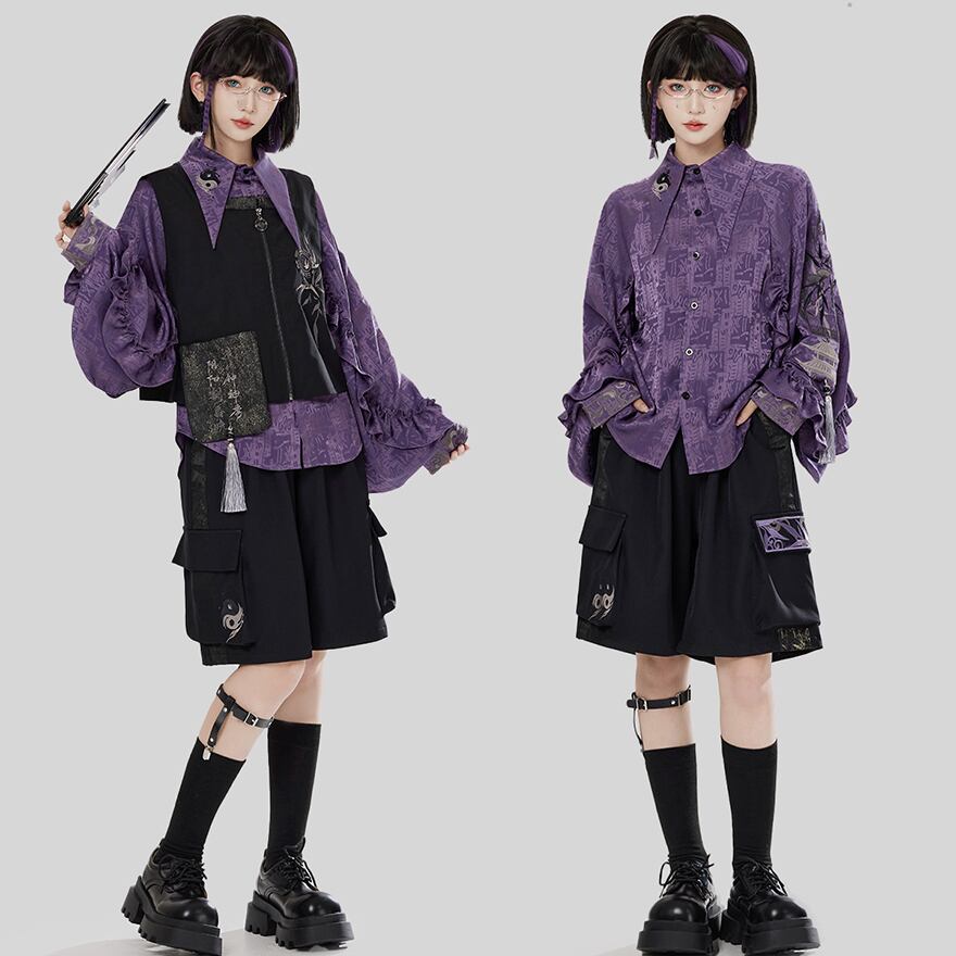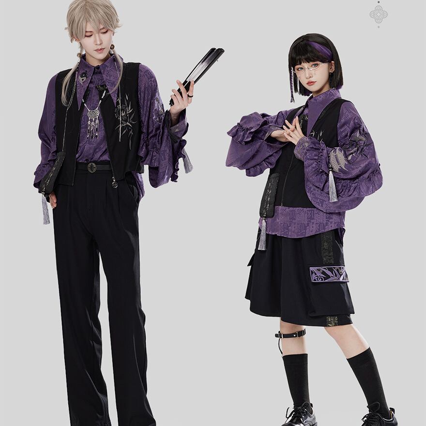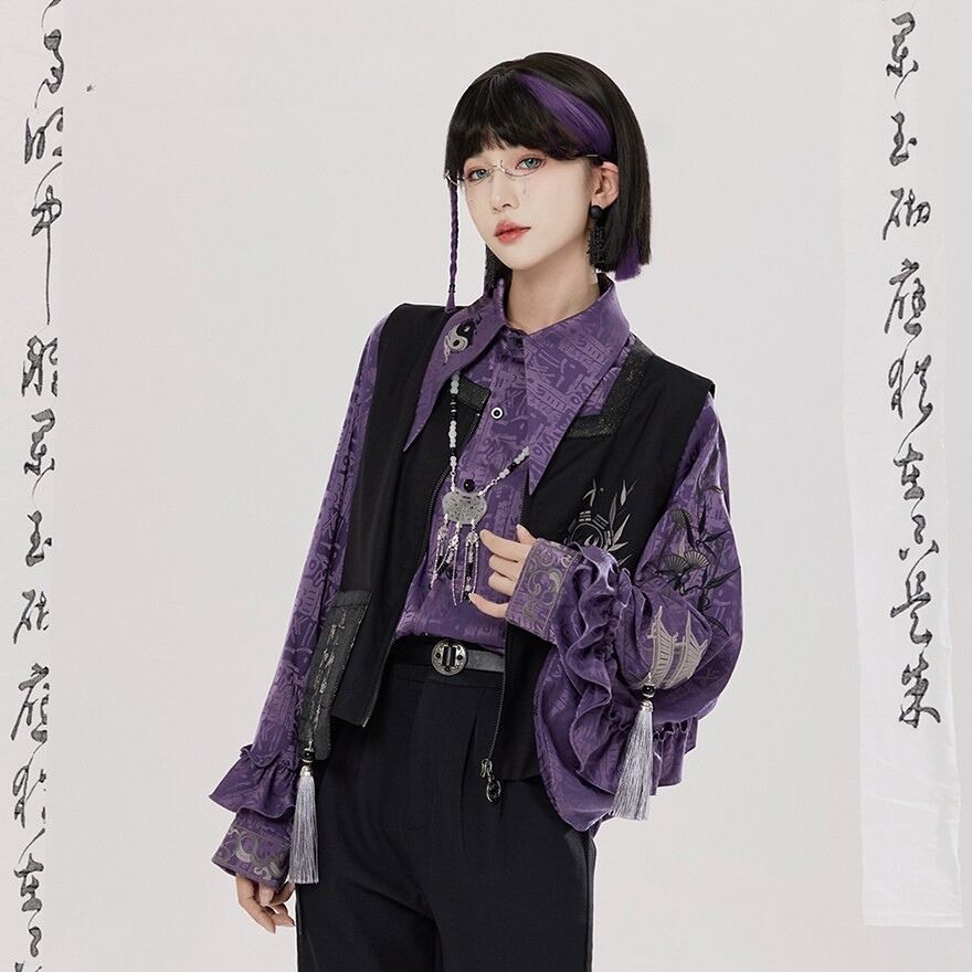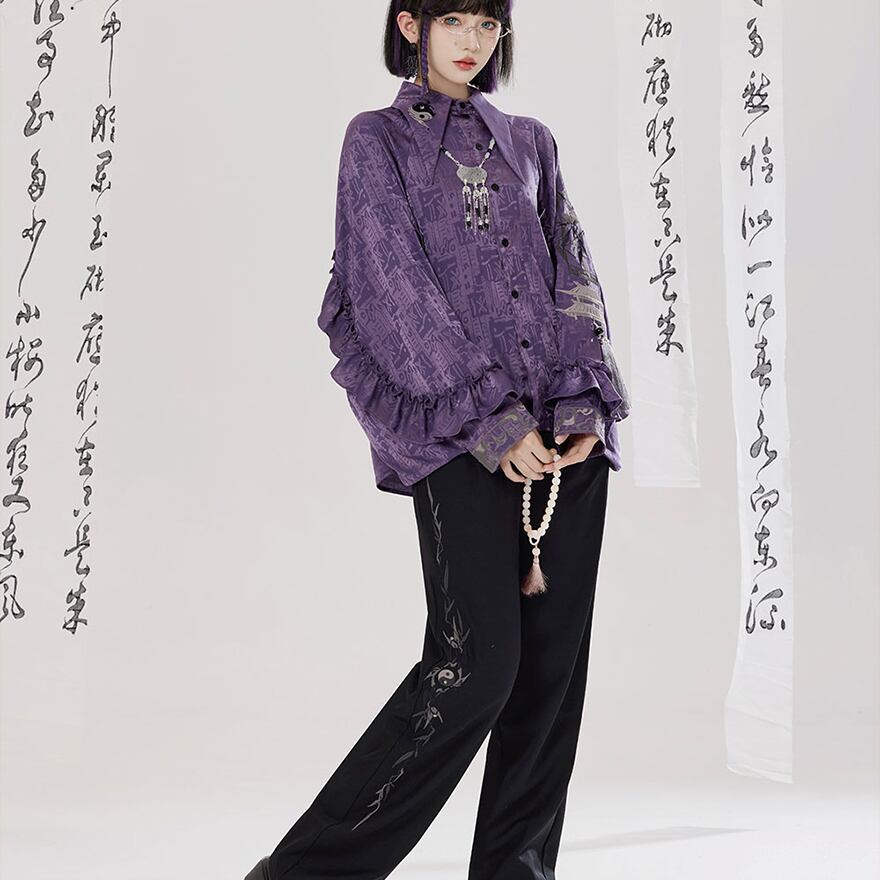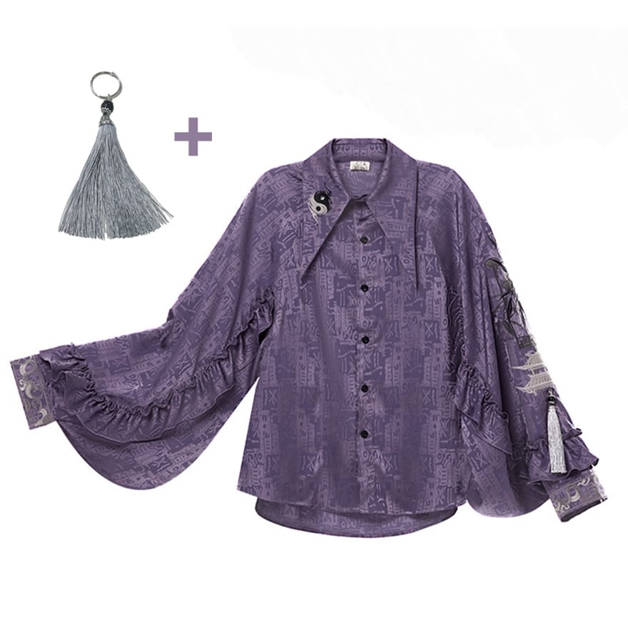 この個性的なタッセル付きシャツは、パープルの地に繊細な刺繍が施された印象的なアイテムです。胸元のタッセルがアクセントになり、全体としてゴシック調の雰囲気を醸し出しています。袖口のフリルがボリューミーなデザインで、独特の存在感を放ちます。