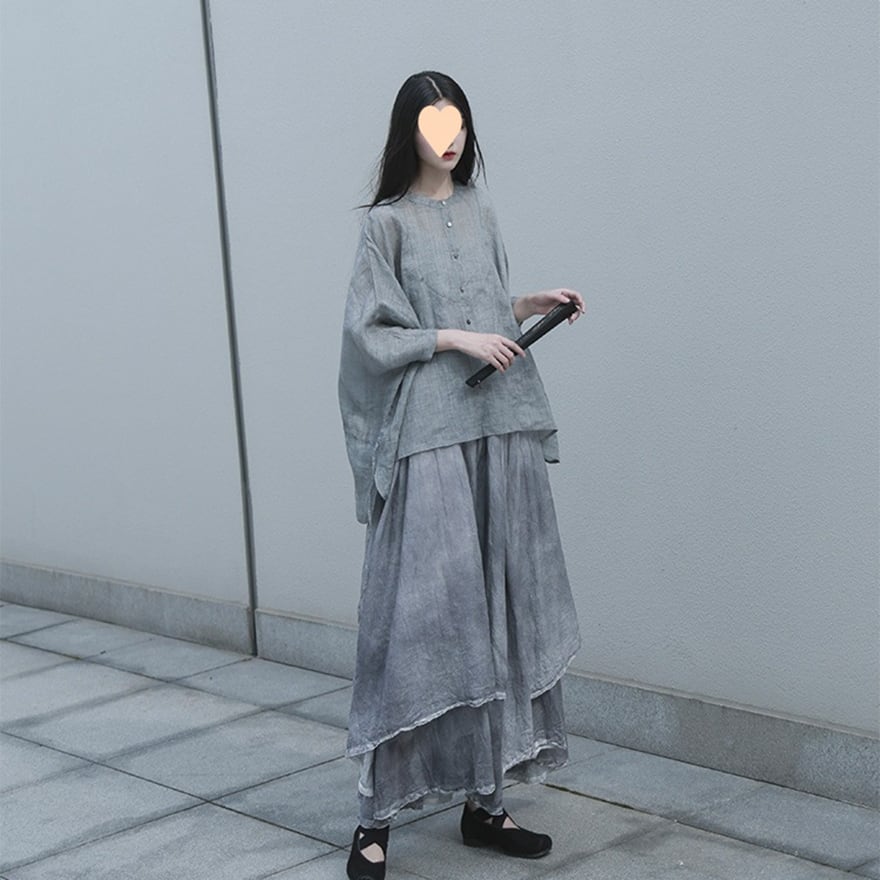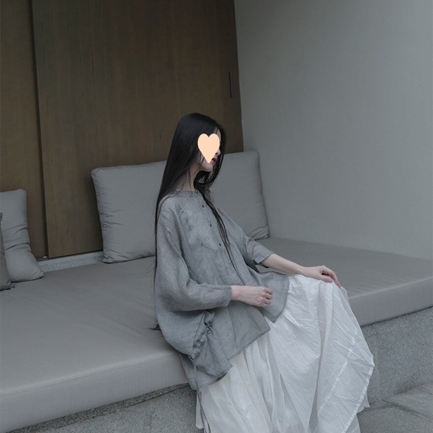 空気のように軽やかなグレーのチャイナ風トップス。ふわりと広がるシルエットと繊細な生地感が、まるで現代に舞い降りた幽玄の物語の一場面のよう。ナチュラルで風合いのあるコットンリネン混素材を使用し、肌ざわりもやさしく、リラックス感と個性を両立。和とモードを掛け合わせた、サブカル系にぴったりの逸品。
