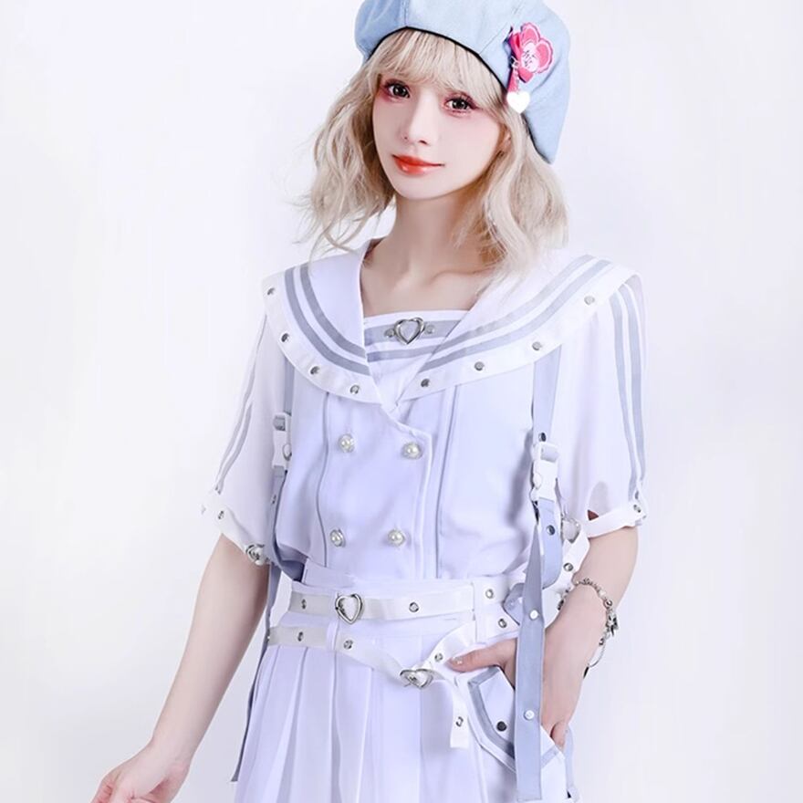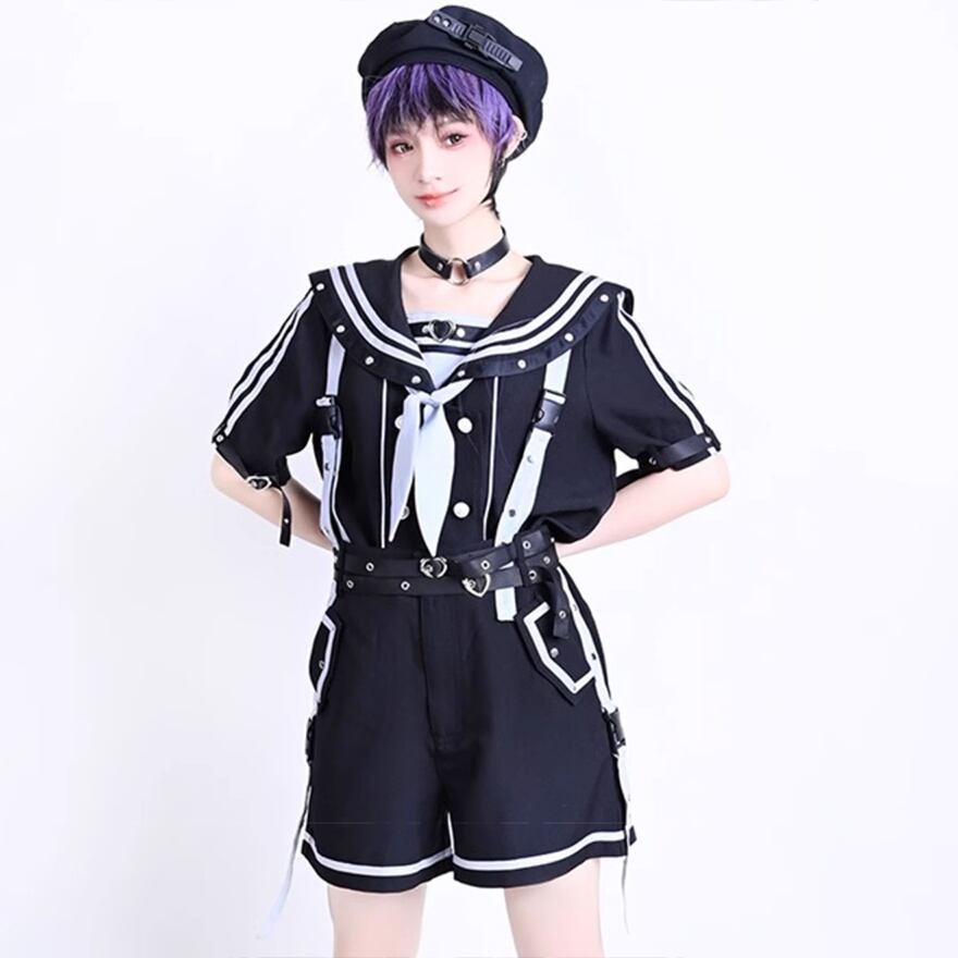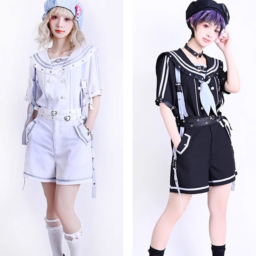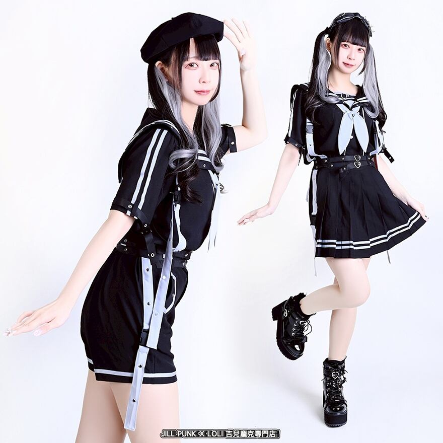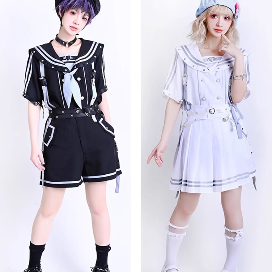 可愛さと毒っぽさが絶妙にミックスされた【パンクセーラー服ワンピース】。クラシカルなセーラー襟に、ハートバックルやメタルスタッズでスパイスを加えた一着。ホワイトは儚げで天使のような印象、ブラックはダークな美しさを放つ地雷系の魅力を纏えます。セットアップ風のショートパンツやプリーツスカート仕様で、動きやすくも存在感バツグン。