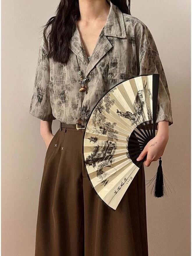関連キーワード: #チャイナ風 #アメカジ #中華系ファッション #半袖シャツ #オープンカラーシャツ #ヴィンテージ風 #ウォッシュ加工 #水墨画風