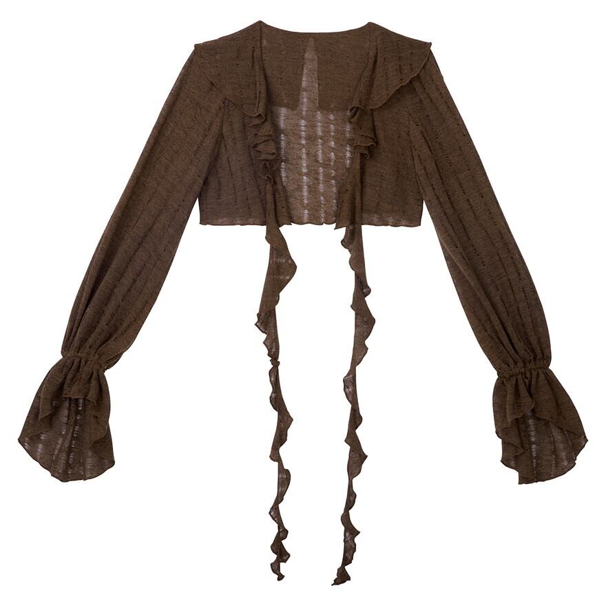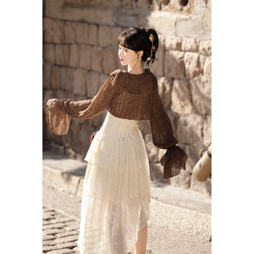 透け感のあるブラウンの羽織りと、繊細なレース生地のワンピースを組み合わせた、奥行きのあるセットアップ。羽織りの軽やかな素材は、風をはらんでふわりと揺れ、優雅なシルエットを描きます。ワンピースは、アシンメトリーなヘムラインとティアードデザインが特徴。