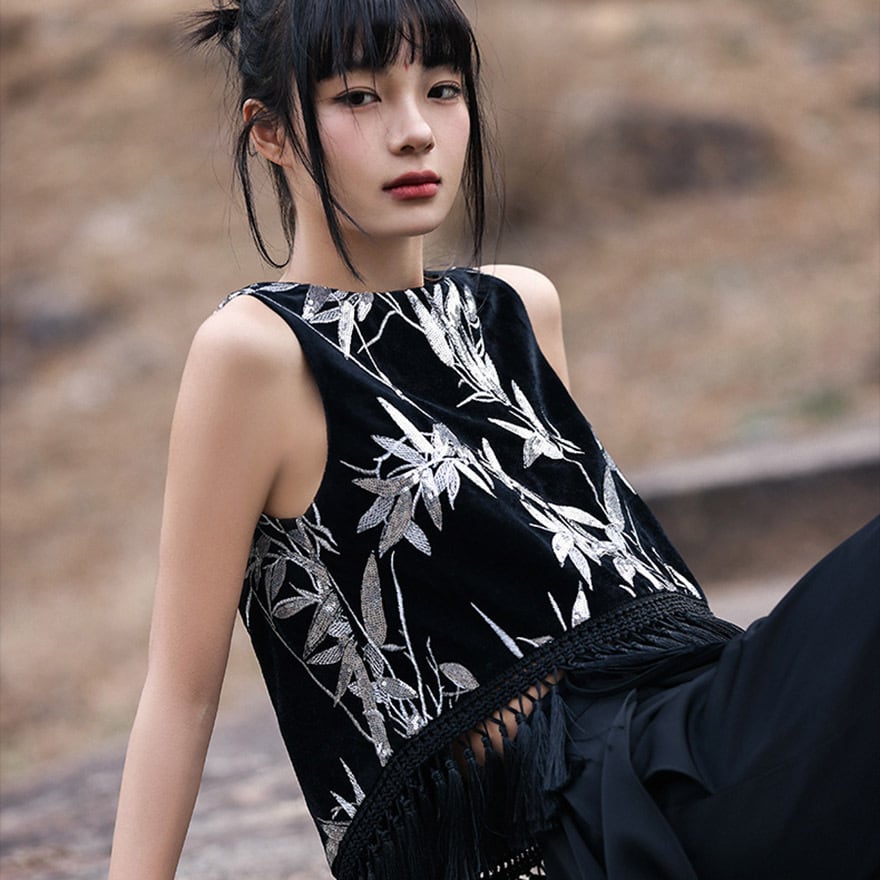 関連キーワード: #サブカル #地雷系 #チャイナ風 #中華服 #ビスチェ #ノースリーブ #フリンジ #竹柄 #個性派 #モード #ストリート #病みかわ #ライブ参戦服 #推し活 #原宿系 #ブラック #ベルベット