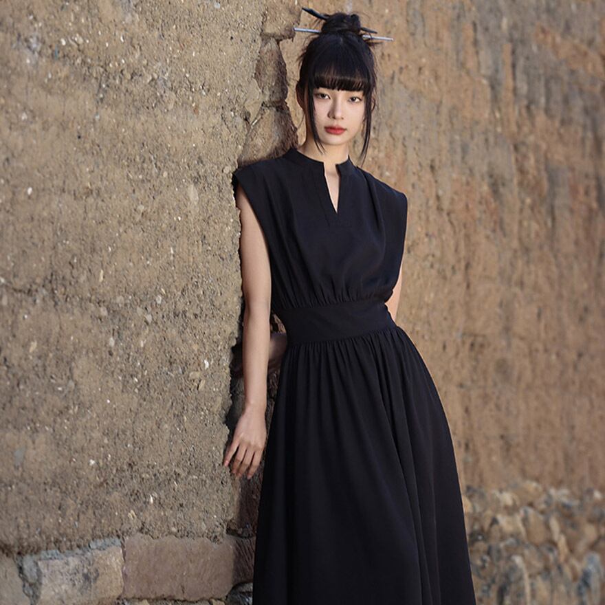 デコルテを美しく見せるシャープなVネック チャイナ風ワンピ 夏服
