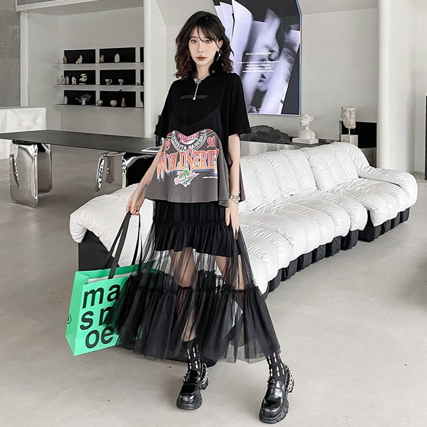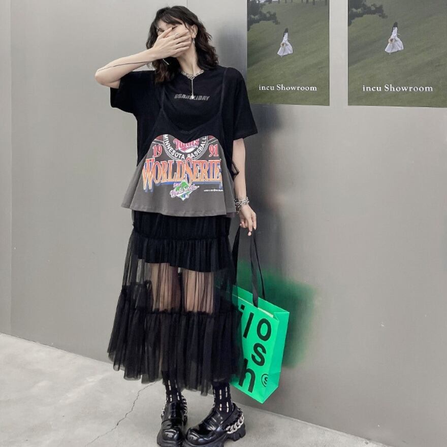 レイヤードが生み出す、こなれたモード感。大人カジュアル チュールキャミワンピ×Tシャツセット
