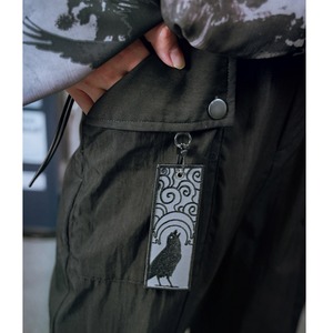存在感を放つサイドポケットには、闇夜に舞う鴉の繊細な刺繍タグがあしらわれ、唯一無二の個性を主張します。