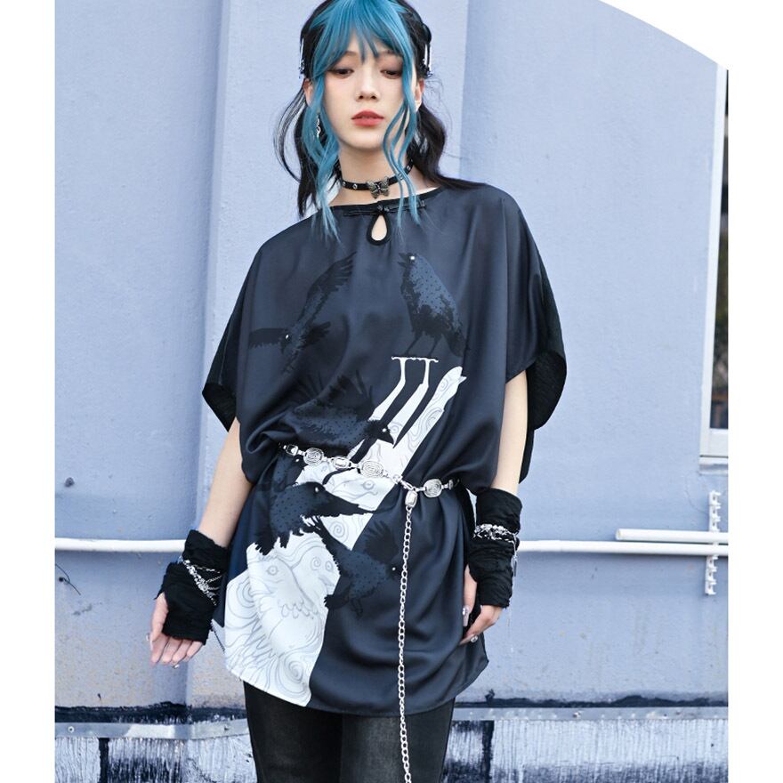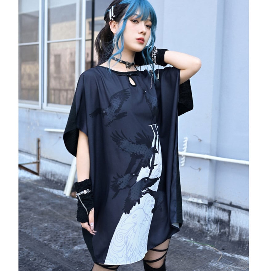 サブカル 服 地雷系 通販 チャイナ風服 古怪舎 ロングTシャツ ミニワンピ 鴉 プリント 中華系ファッション