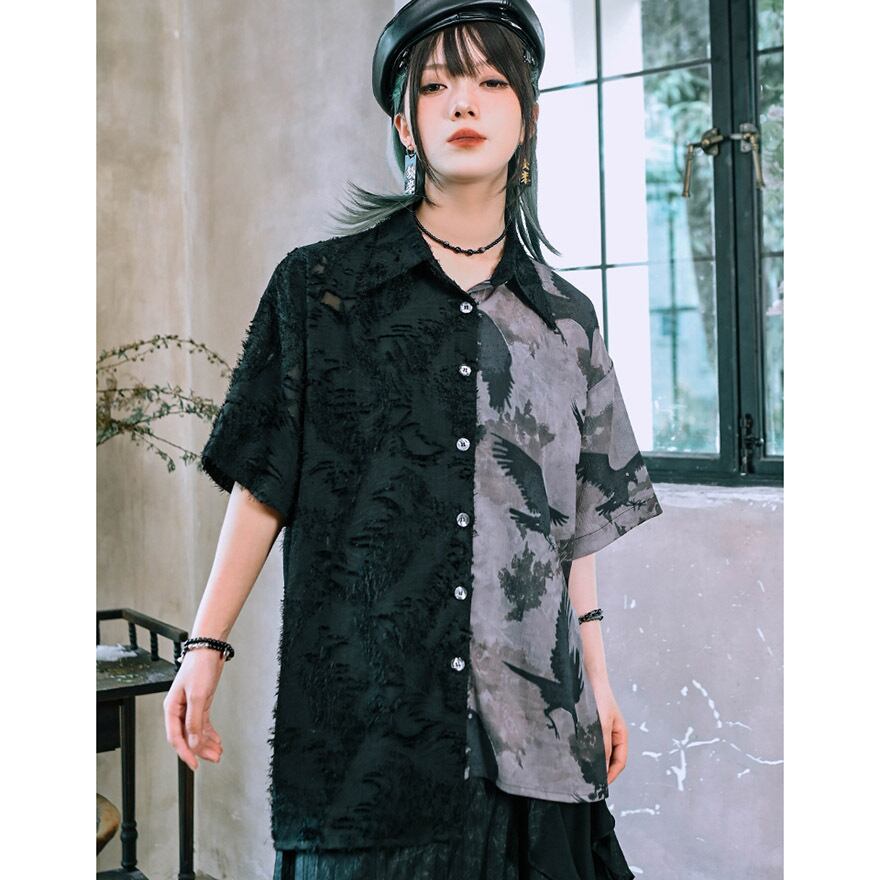 関連キーワード: #地雷系 #サブカル #ゴシック #モード系 #アシンメトリー #半袖シャツ #鴉 #古怪舎 #ダークファッション #病みかわいい #ユニセックス #柄シャツ