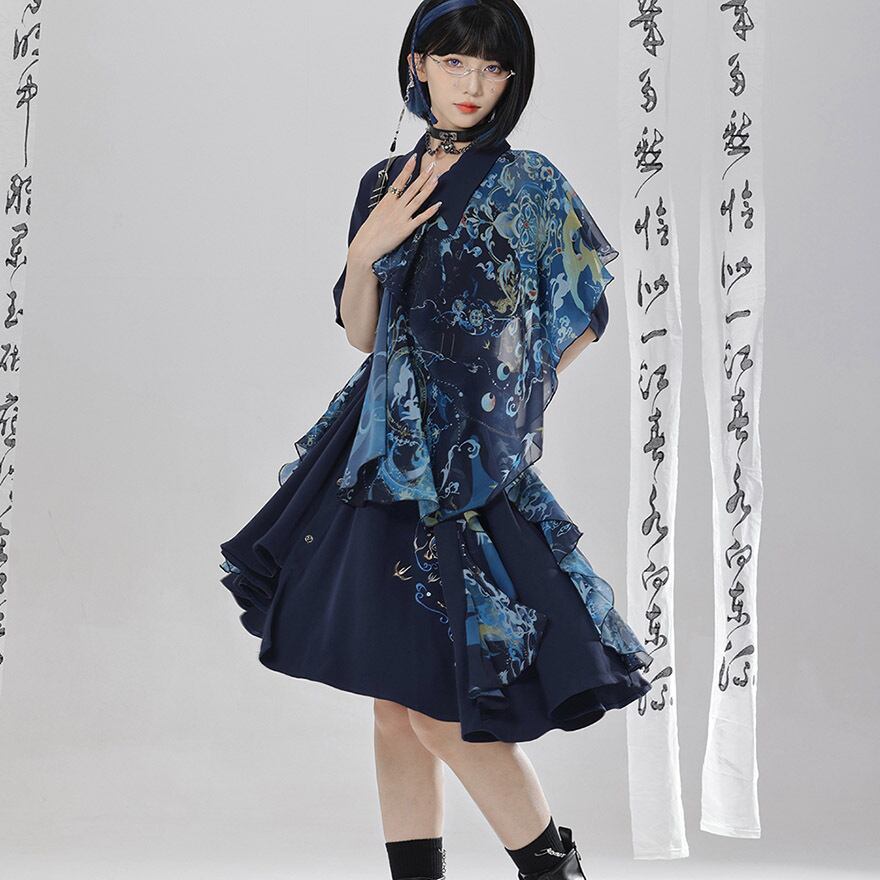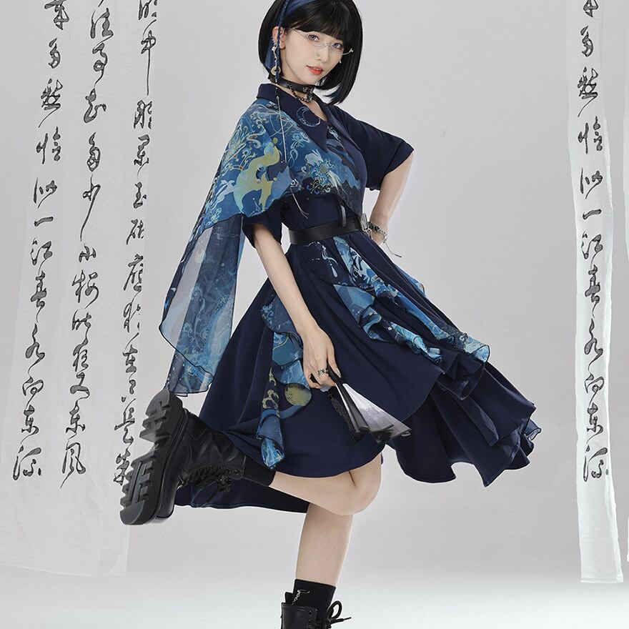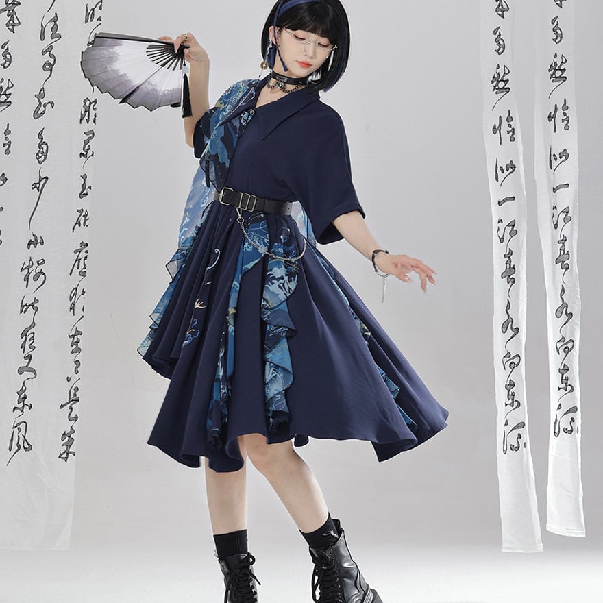 サブカル 服 地雷系 通販 チャイナ風服 ワンピース ネイビー ウエストベルト付き 卿棠オリジナル