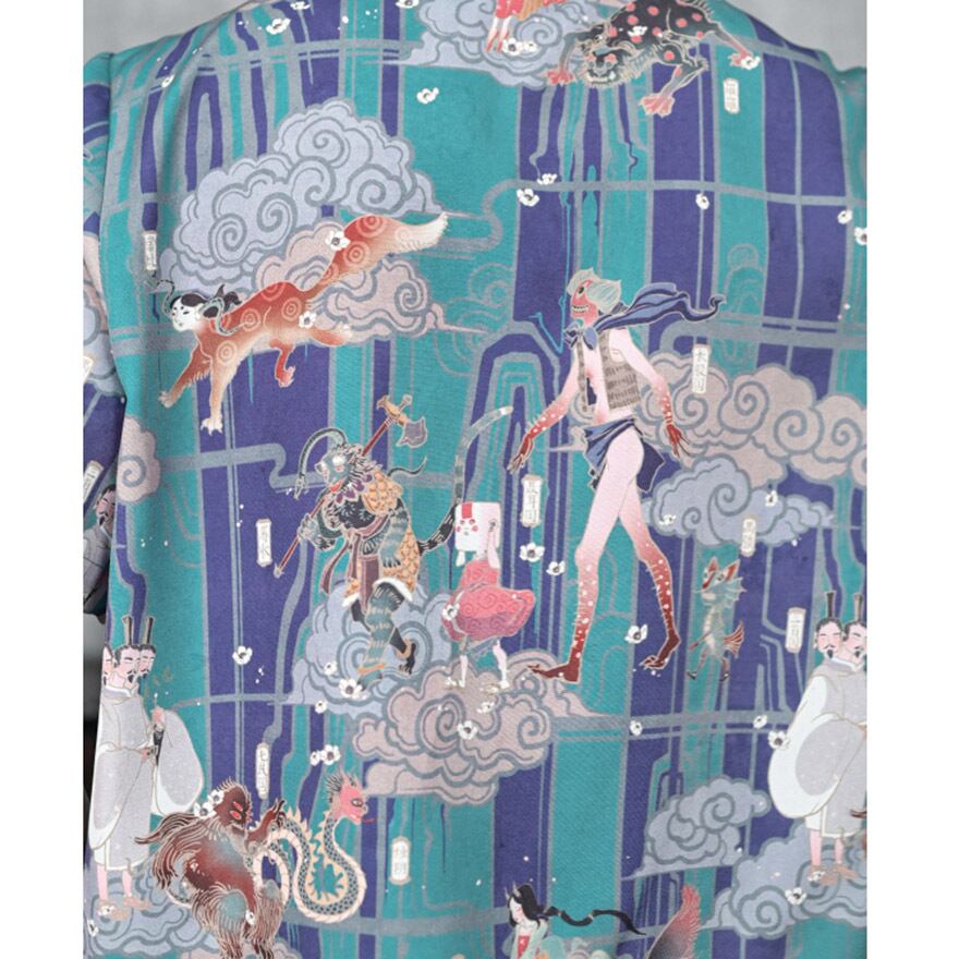 中国の神話や故事を彷彿とさせる、幻想的でアーティスティックなプリントが全面にあしらわれた半袖シャツです。