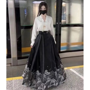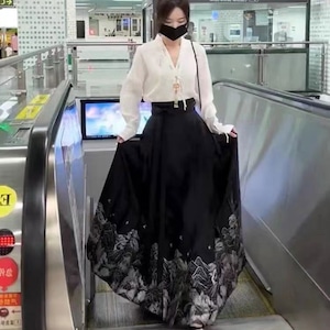 この華やかなチャイナ風セットアップは、ホワイトのブラウスとブラックのロングスカートで構成されています。ブラウスのフロントにはリボンのディテールが施され、スカートにはモノクロの山岳風景がプリントされた繊細なデザインが特徴的です。上品さと個性が両立したこのアイテムは、サブカル系ファッションを愛する方にぴったりです。