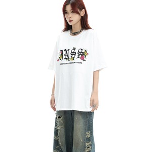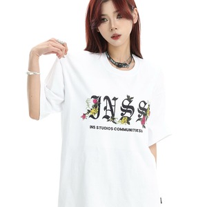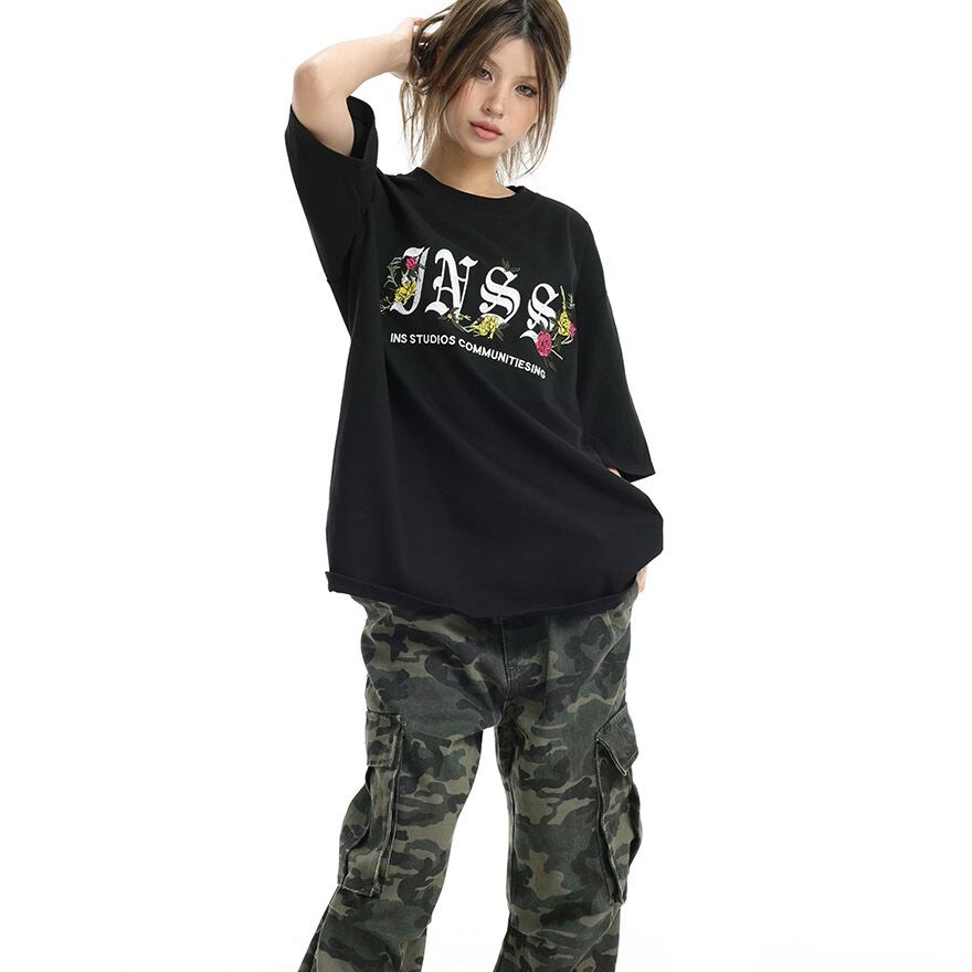 サブカル系とストリートが融合したような半袖Tシャツが登場!ゴシック調のクールな「INSS」ロゴに、繊細な花柄の刺繍(またはプリント)を組み合わせた、病みかわいい雰囲気漂うデザインが魅力です。洗濯してもへたりにくく、長く愛用できるタフさも兼ね備えています。シルエットはトレンド感満載のゆったりとしたオーバーサイズ。ドロップショルダーで肩のラインを拾わず、華奢見せ効果も期待できます。一枚着るだけでコーデの主役になる、存在感抜群のアイテムです。