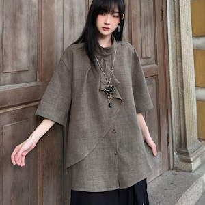 この独特のデザインのチャイナ風半袖シャツは、サブカルファッションを楽しむ方々に最適なアイテムです。ライトグリーン、ブラック、ブラウンの3色展開で、様々なコーディネートに合わせやすい。シンプルながらも存在感のある佇まいが、個性的な雰囲気を醸し出します。