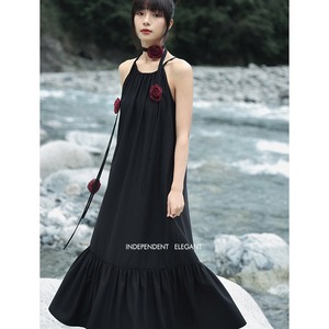 しなやかなブラック生地に、深紅の薔薇のコサージュが映える、チャイナ風のロングサスペンダードレスです。