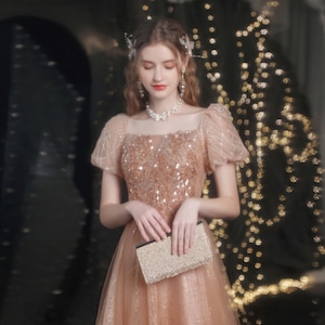 優しく肌に馴染むシャンパンゴールドのチュールが、この上なく上品で温かみのある雰囲気を醸し出すロングドレスです。
