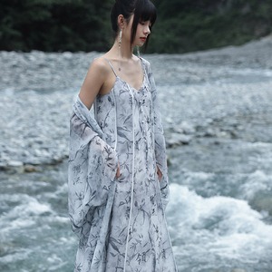 ゆったりとした着物スリーブ風の袖と、足元まで届くロング丈が、風を受けて優雅に揺らめき、涼しげな印象を与えます。