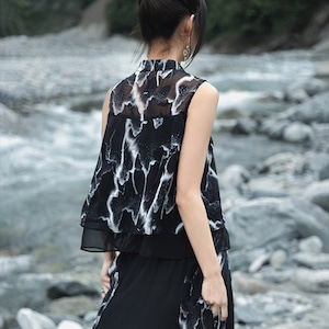 軽やかなブラックのシフォン素材に、雷や稲妻を思わせるような、あるいは水墨画のようなダイナミックなホワイトの抽象プリントが全面に施された、チャイナ風ノースリーブシャツです。