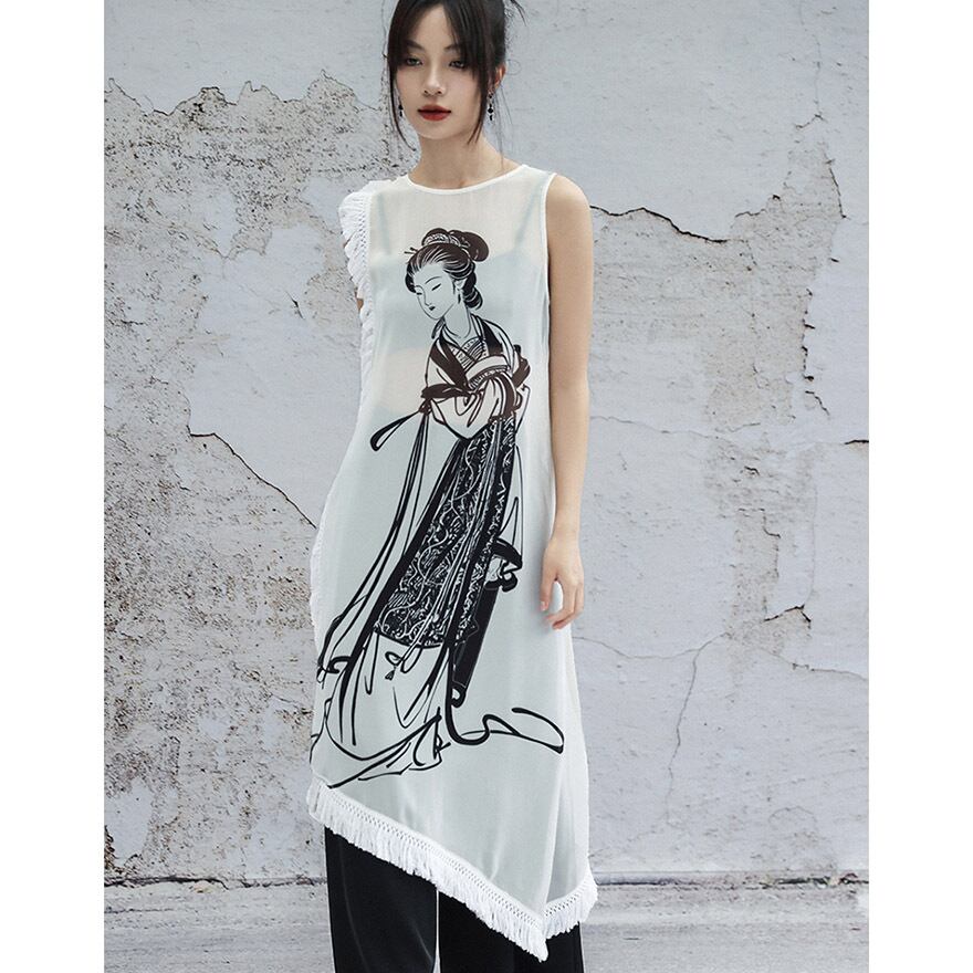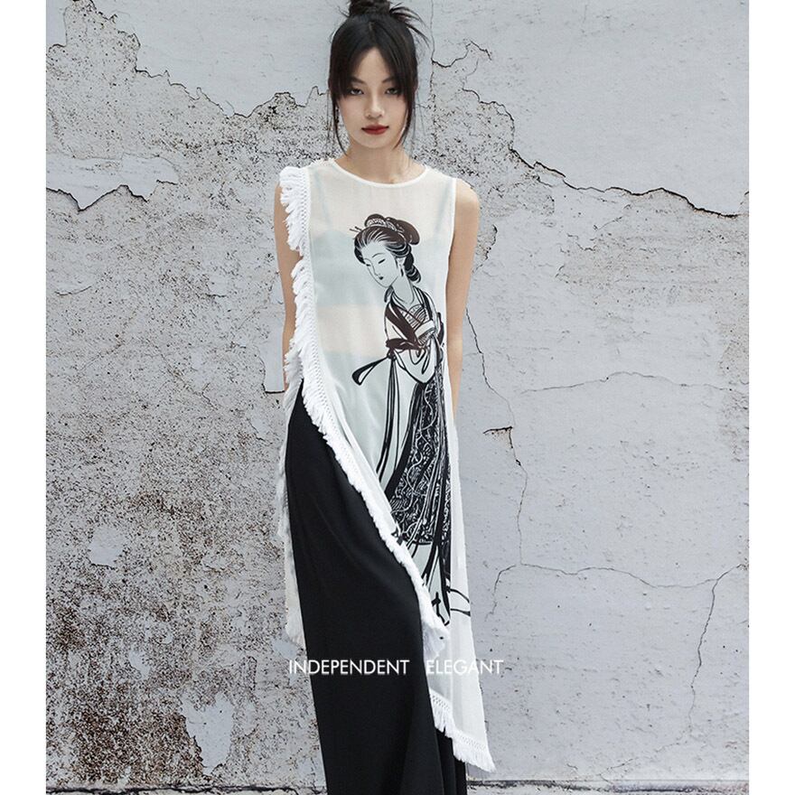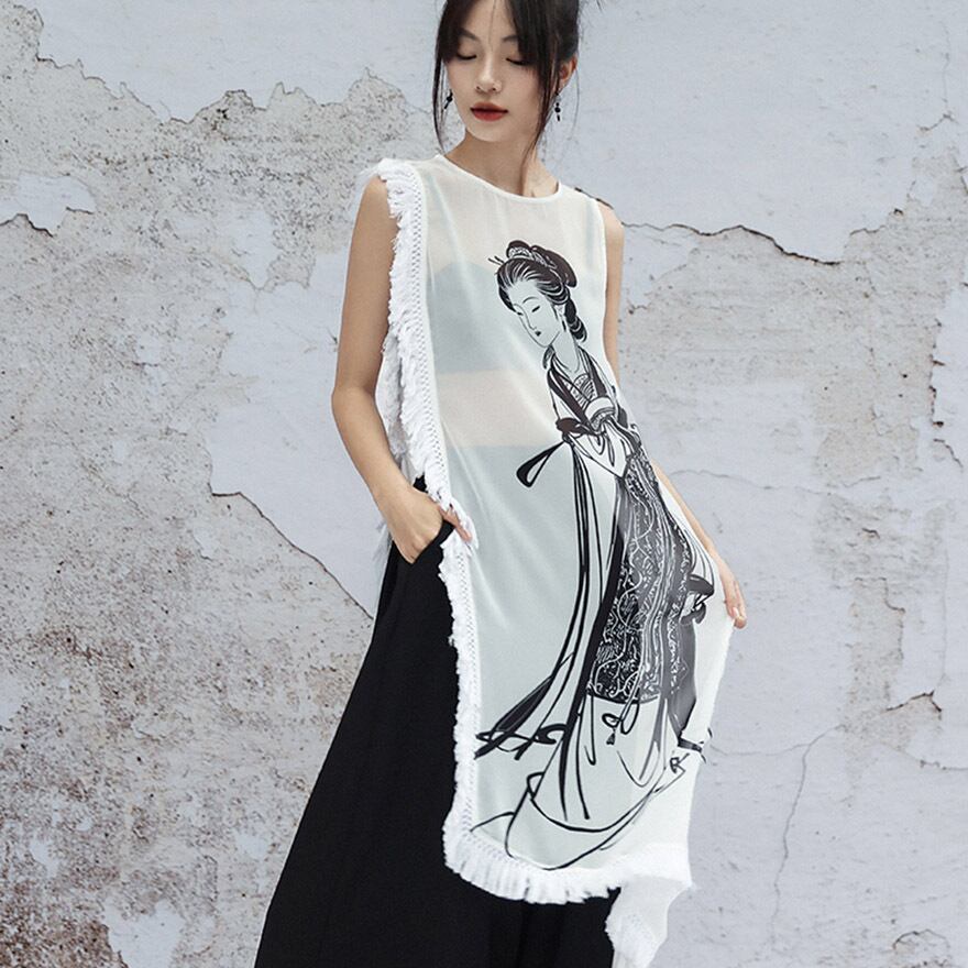 透け感のある軽やかなシフォン素材に、水墨画のようなタッチで描かれた美人画が大胆にプリントされたロングジレです。