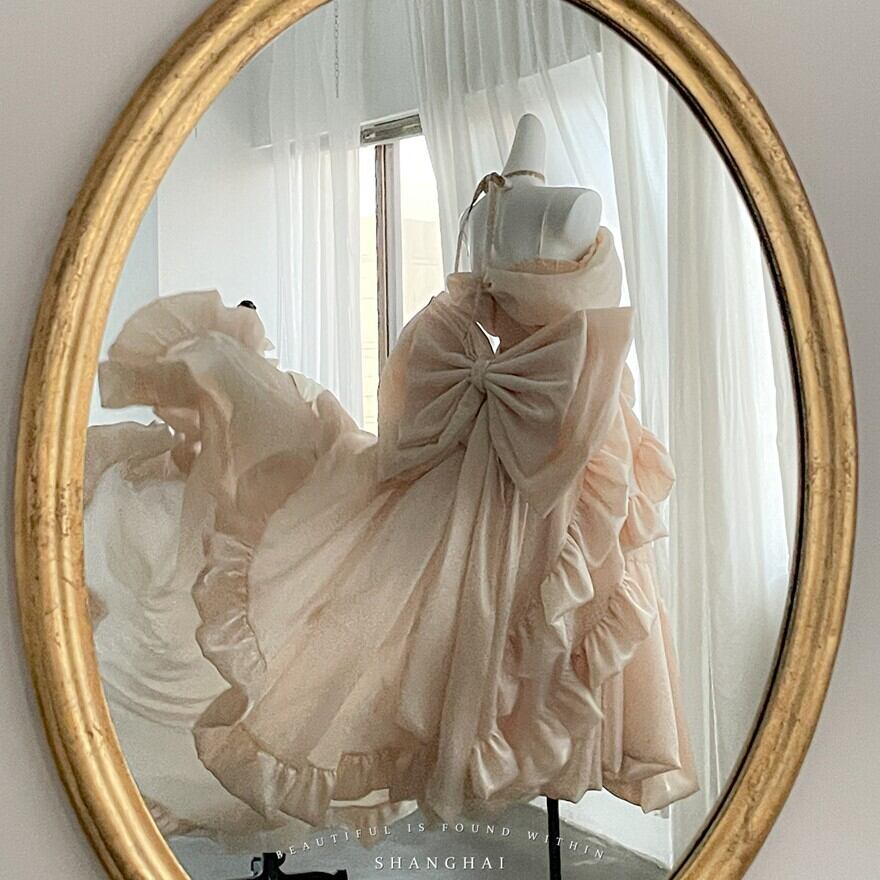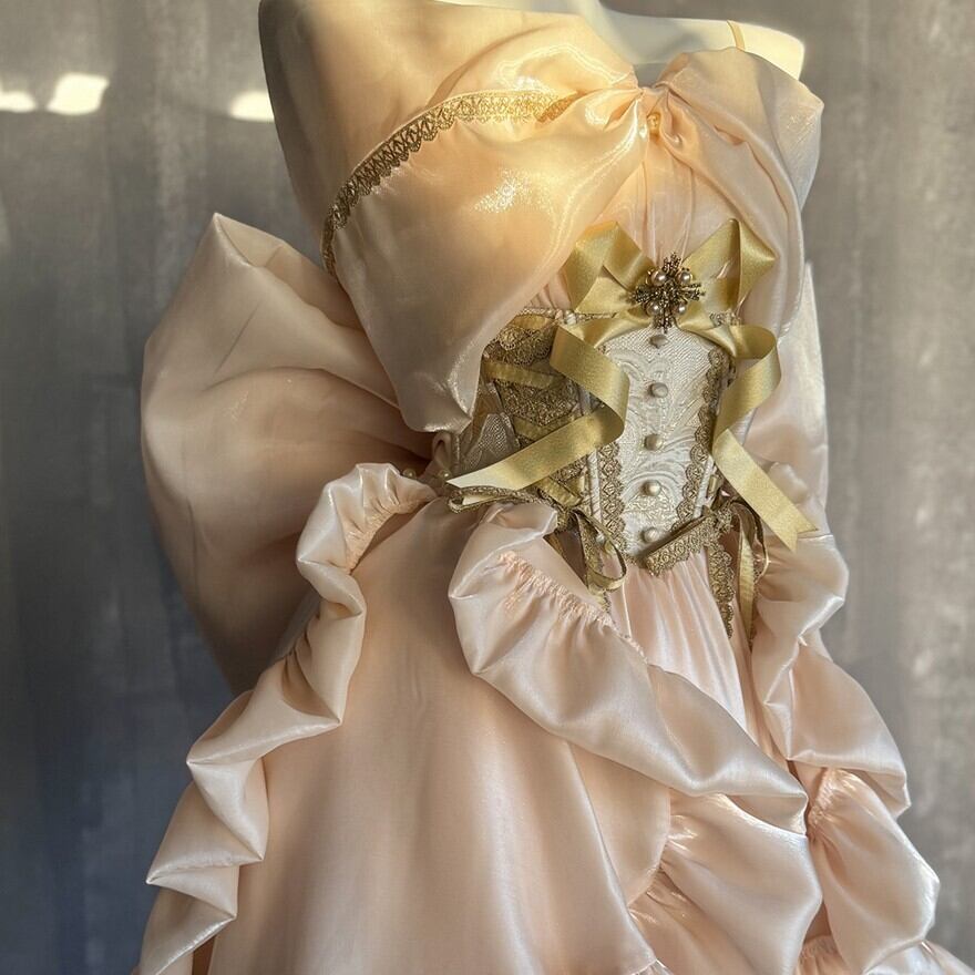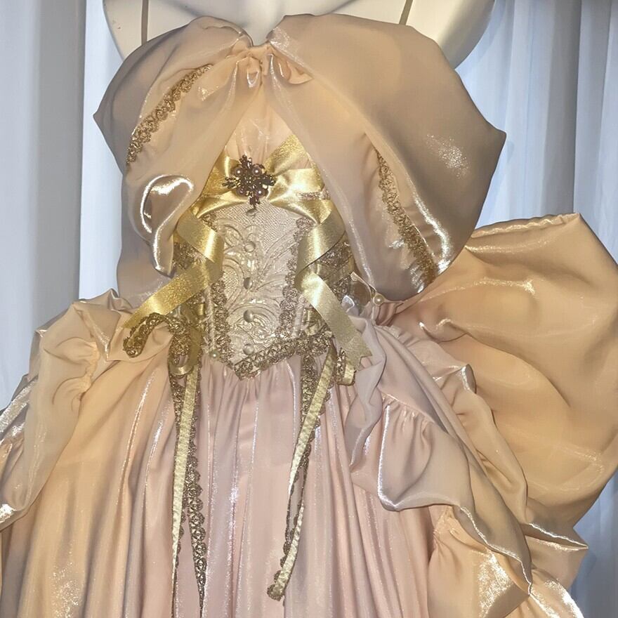 淡いシャンパンゴールドの光沢が、まるで夢の中のドレスのようなロリィタドレスです。大胆なバックリボンとふんわりとしたシルエットが、後ろ姿まで印象的に演出。繊細なレースと胸元の装飾が、上品でクラシカルな雰囲気を醸し出します。特別な日に、あなたを最高に輝かせる一着です。