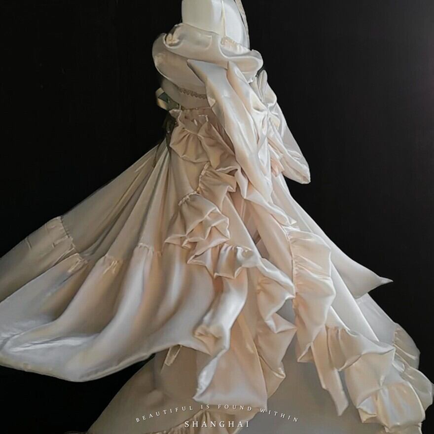 ・光沢のある生地とたっぷりのフリルが、動くたびに優雅なシルエットを描き出します。
