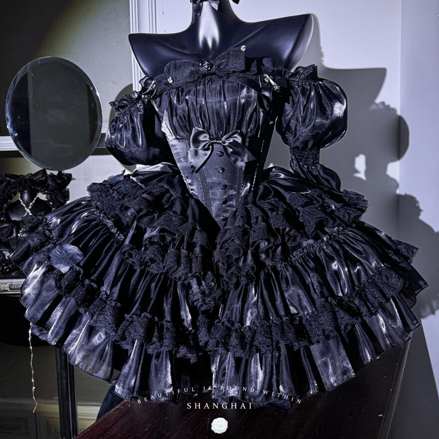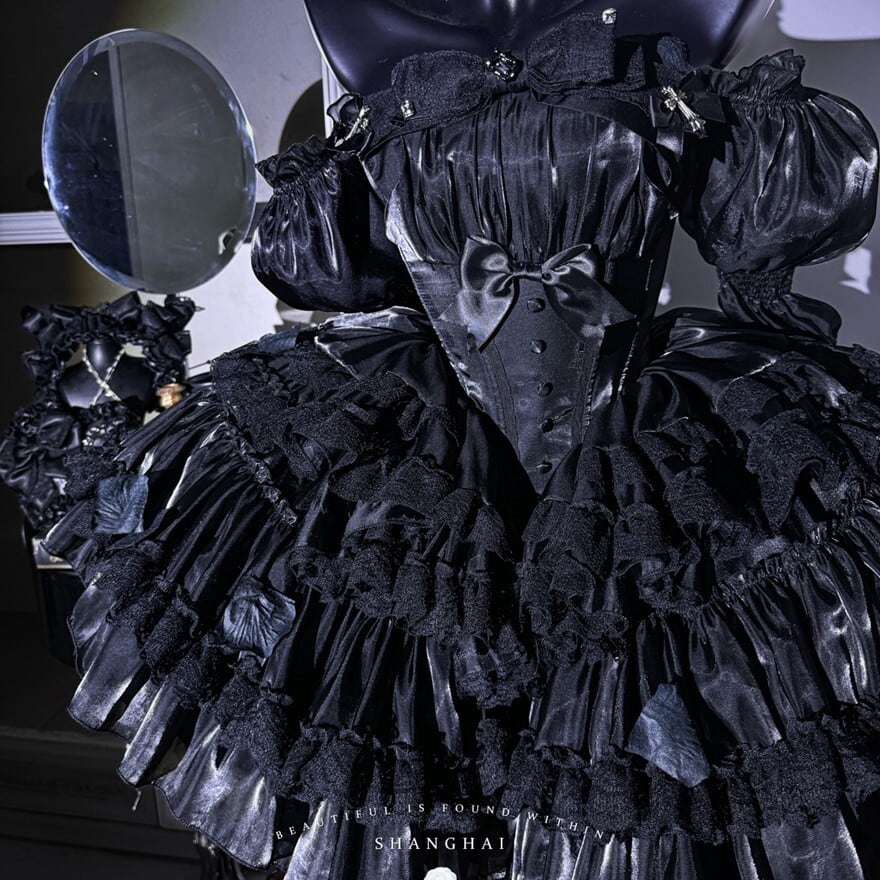 深みのあるブラックサテンが、妖艶な光沢を放つゴシックロリィタドレス。