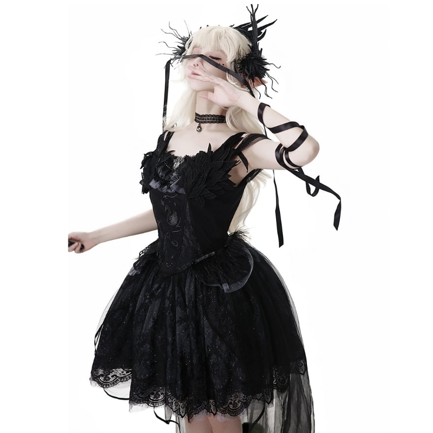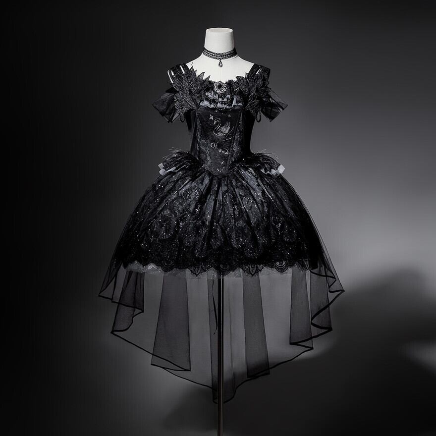 肩を飾る黒鳥の羽のような装飾、きらめくラメレースのスカート、そして歩くたびにドラマティックに揺れるシアーなフィッシュテール。背面の編み上げデザインが、後ろ姿まで美しく演出します。細部までこだわり抜いたディテールが、このゴスロリ服を唯一無二の存在に昇華させています。